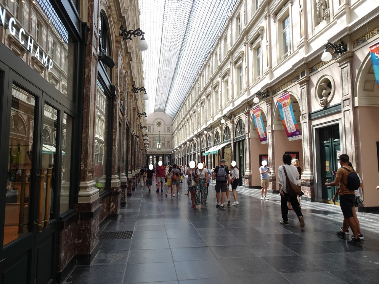 グランプラスから徒歩3分ほどのところにあるアーケード街です。1847年に完成した世界最古のアーケードだそうです。装飾された入口から入ると、ガラス張りで豪華なアーケード街が現れます!!!。キラキラした世界が待っていました♪。そこにいるだけでもワクワクしますが、ショップも魅力的です。チョコレートショップがいくつもあったり、ブランドショップ、スイーツショップなど、ついお買い物しちゃうお店が並んでいます!!!。散策とショッピング両行が楽しめますよ♪。