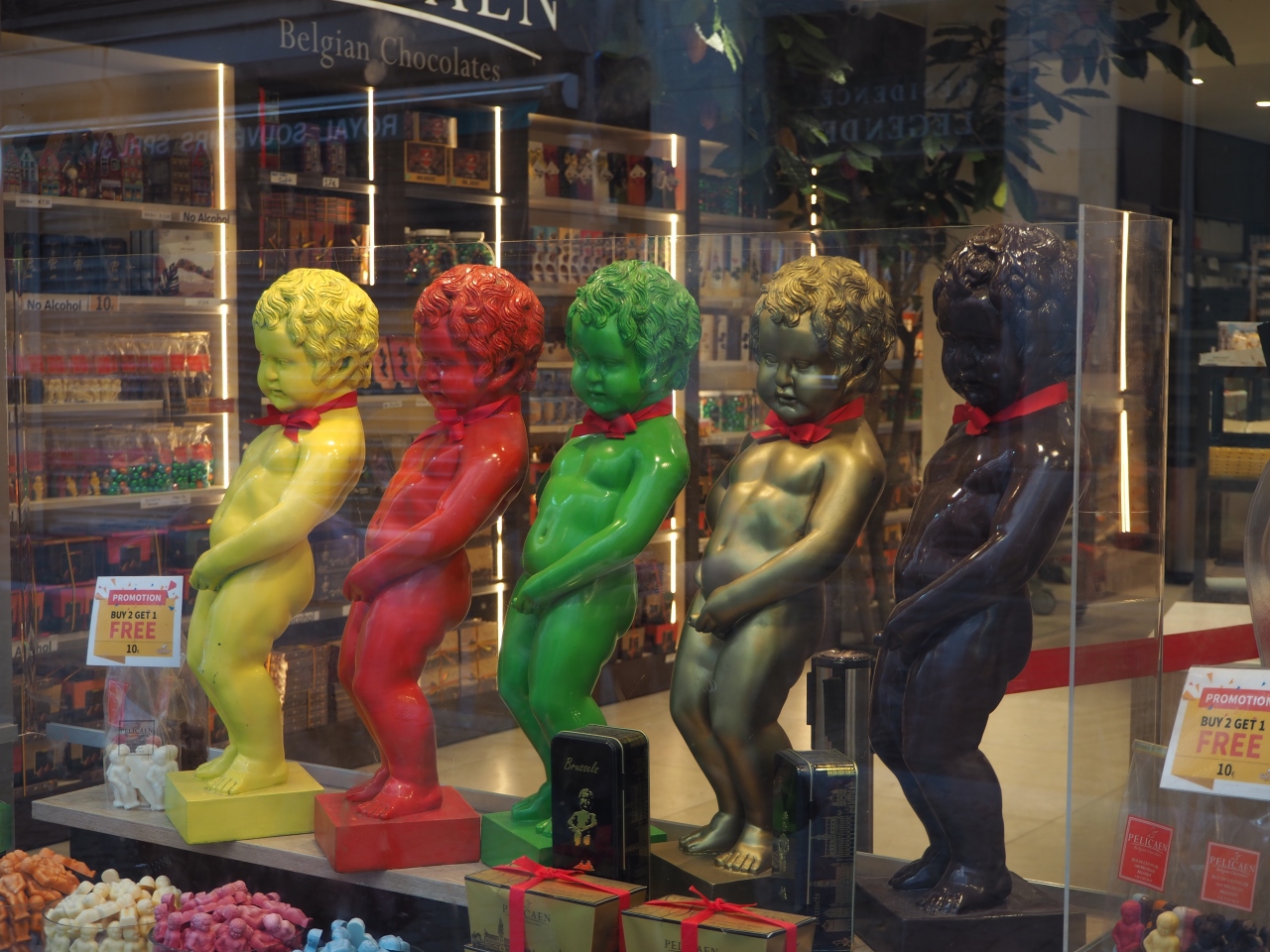 どう言われようと、とにかく日中はスゴイ人だかりです。朝9時ごろまでならハイシーズンでも人はそれほどいてませんから、記念写真なども取りやすいですよ。また、周辺のチョコレートショップのショーウィンドウに飾られたカラフルな小便小僧も心を和ませてくれます。