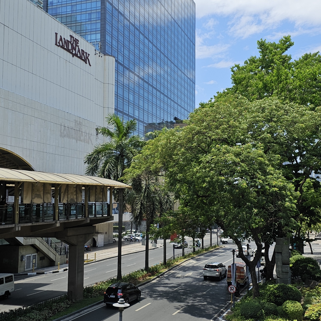 アヤラ駅の改札口広場からは、大型商業施設「SMマカティ」→「グロリエッタ」→「ザ ランドマーク」の順になります。