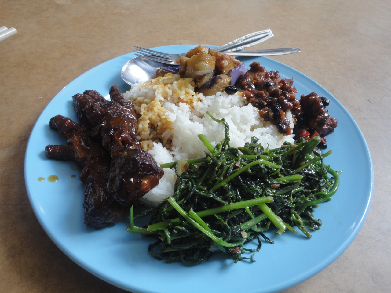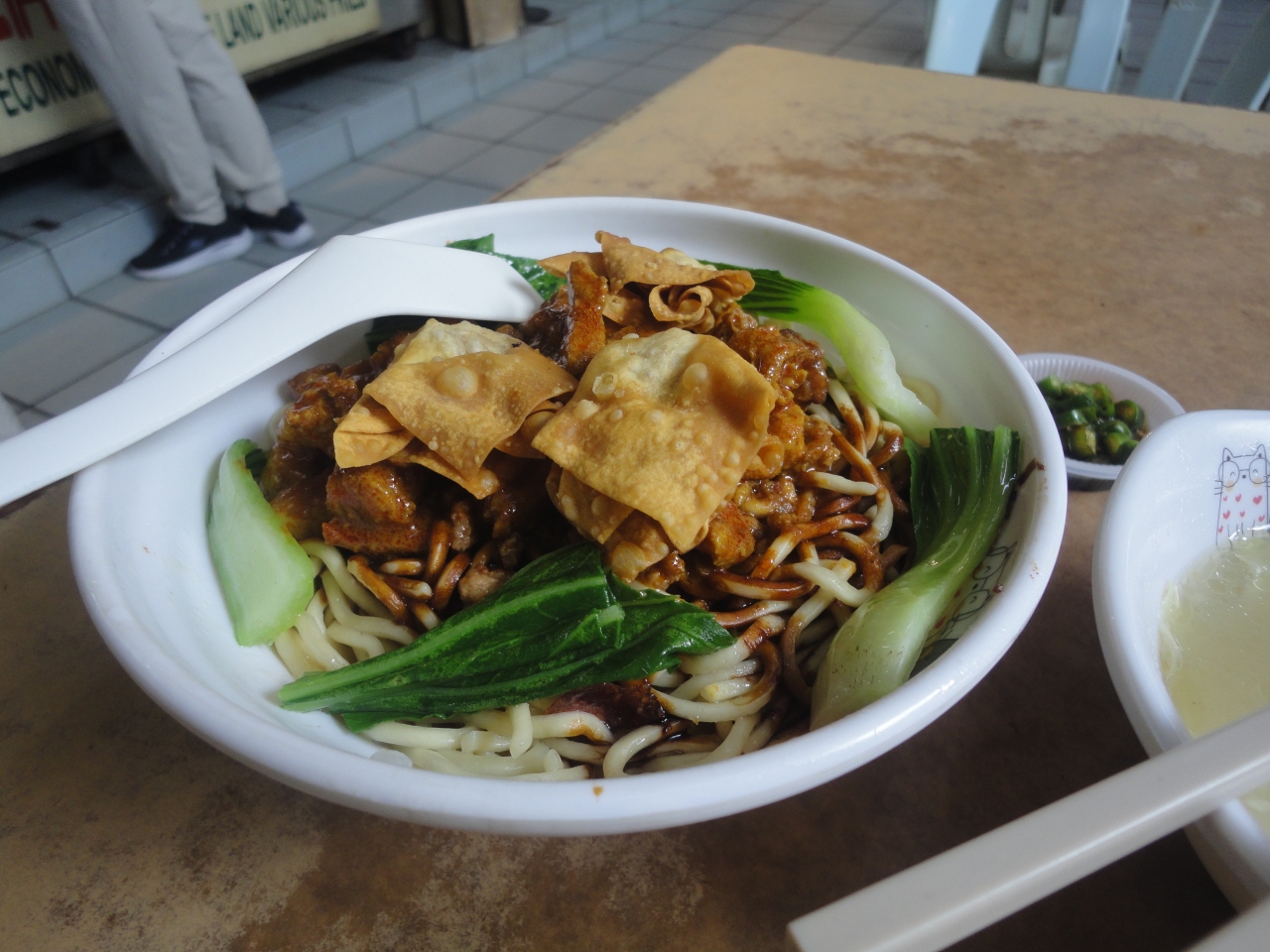 チャイナタウンにあるフードコートです。中央が飲食スペースになっていて、その周りに多くのお店が並んでいました。ラクサ屋さん、ワンタンミー屋さん、お惣菜屋さんなど。ドリンク屋さんではジュースだけでなく、ビールや、中国茶などもありました。どのお店もお安くて、お惣菜屋さん(経済飯?)でご飯の上に4-5種類のおかずを乗せても、13RMだったかと思います。