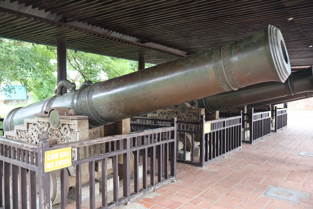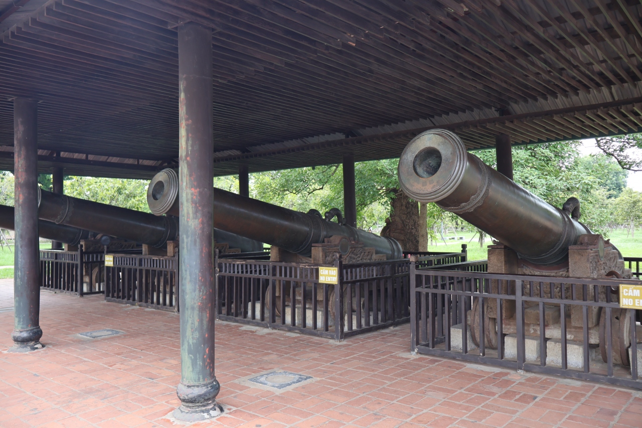 阮朝王宮に行く時、ツアーのバスを降りてから歩いて大砲前に行きました、王宮門(午門)・堀の手前にあります、9つの大砲が屋根付きの建物内に展示されていました、身近で見ることが出来ます、立派な大砲です、1803年に1年かけてつくられたようです、大砲は使われたことはないようです。