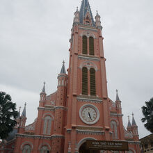 市街地からはやや離れた場所にあるピンク色の外観が特徴的な教会です。