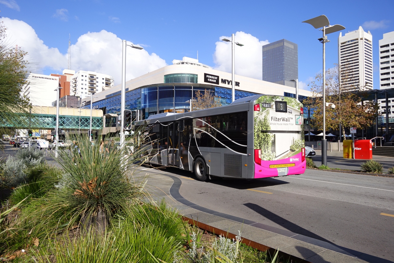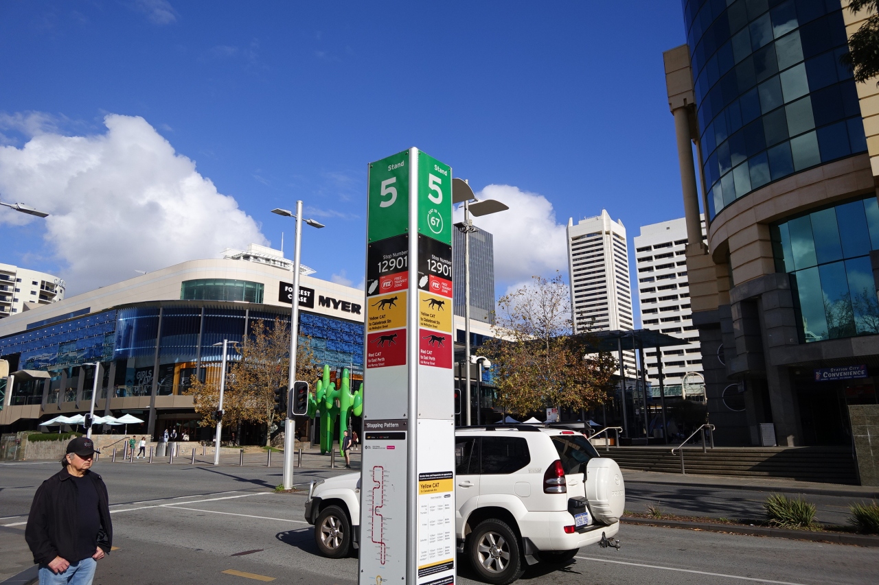 パース市内はたくさんのバスが走っていますが、観光客には中心部を走っているCATバスを使いこなせればとても便利です。料金が無料なので一駅で利用する人もいます。手を挙げれば止まってくれ、降りるときにはチャイムで知らせます。バス停には次のバスが来るまでの時間が表示されており、とても分かりやすいです。