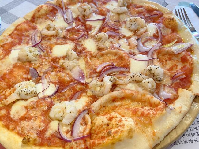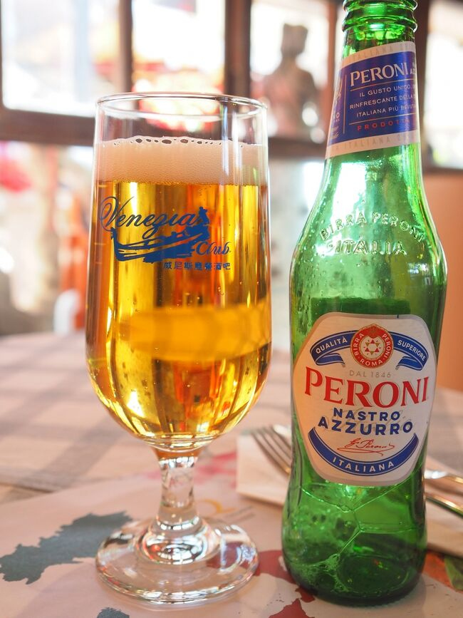 私はイタリアレストランでピザとビールをいただきました。