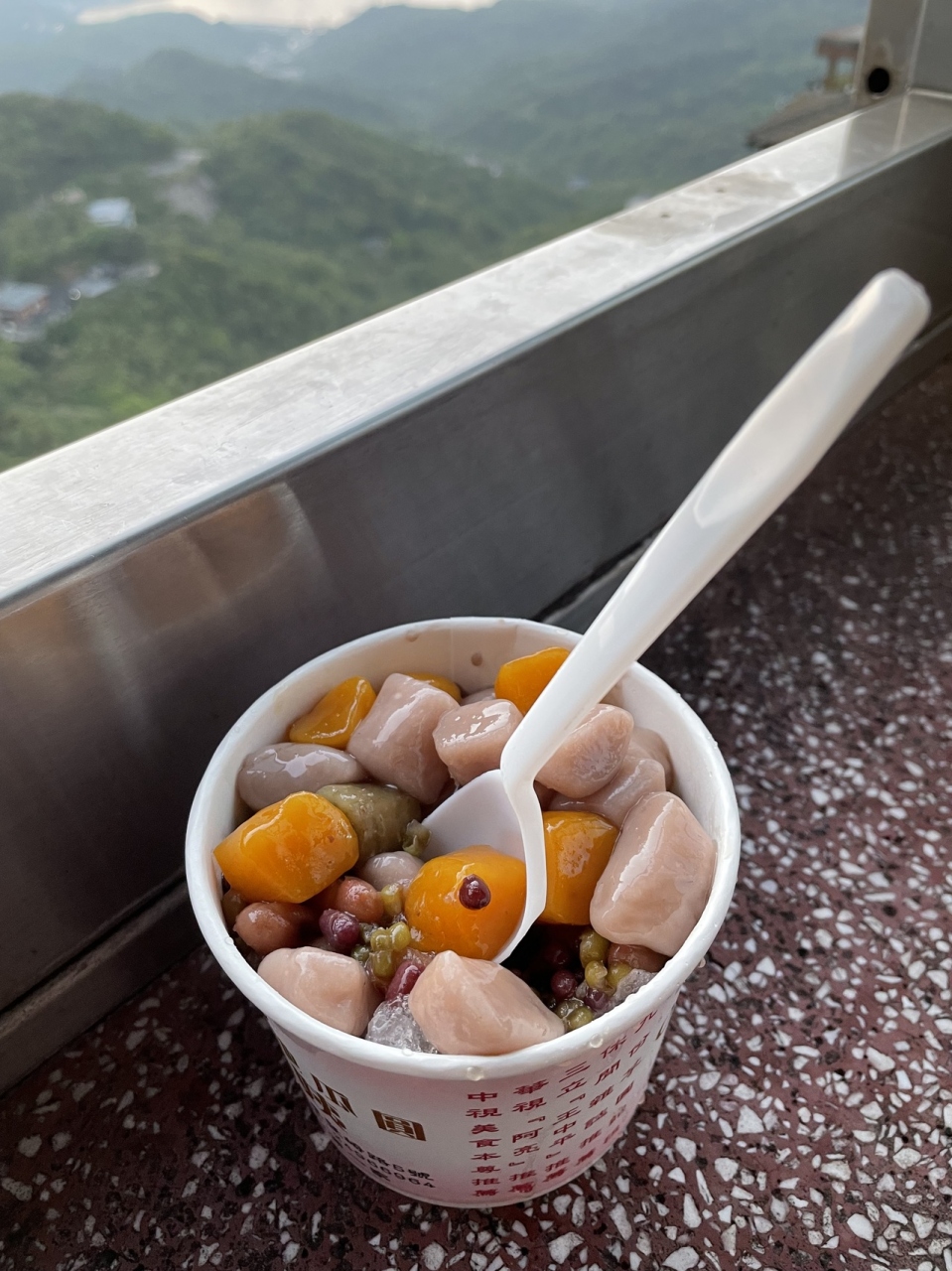 九分の中心、階段を上って一番上のあたりにあります。タロイモボールを初めて食べましたが、評判通り冷たいものもおいしかったです。奥のイートインスペースからは、湾の様子がとてもきれいに見えました。階段がきついけど、また行ってみたいな。