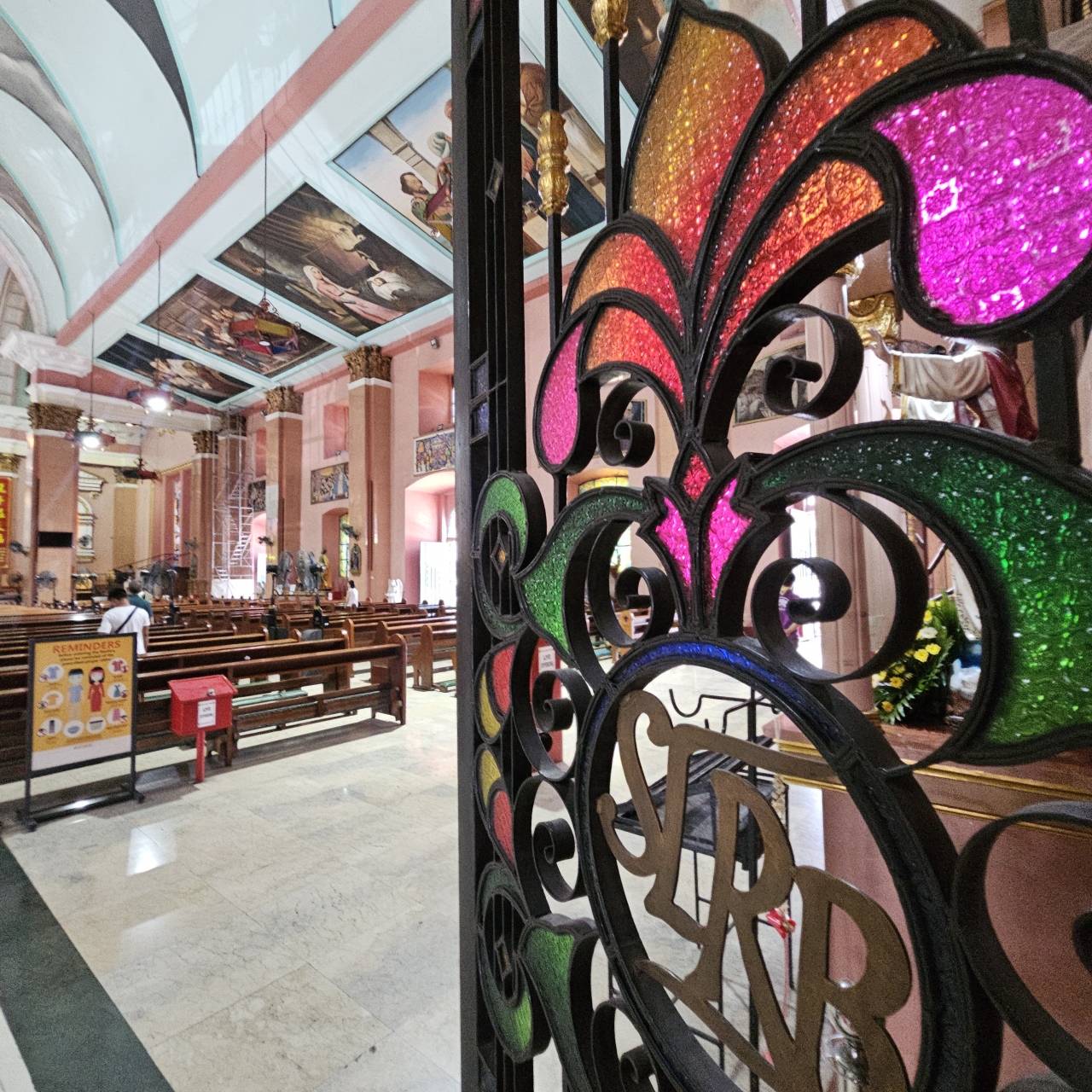内部はバロック様式を取り入れた装飾、入口のステンドグラスも綺麗です。