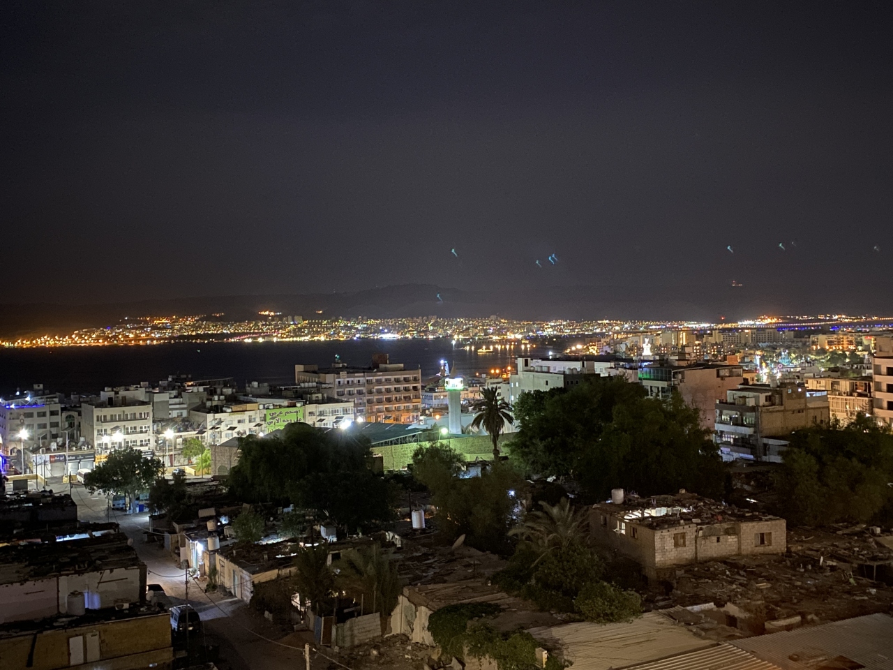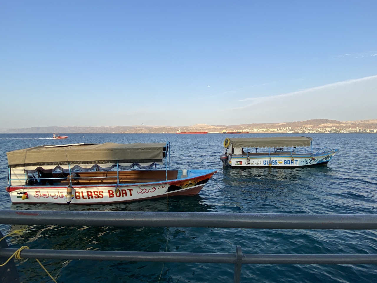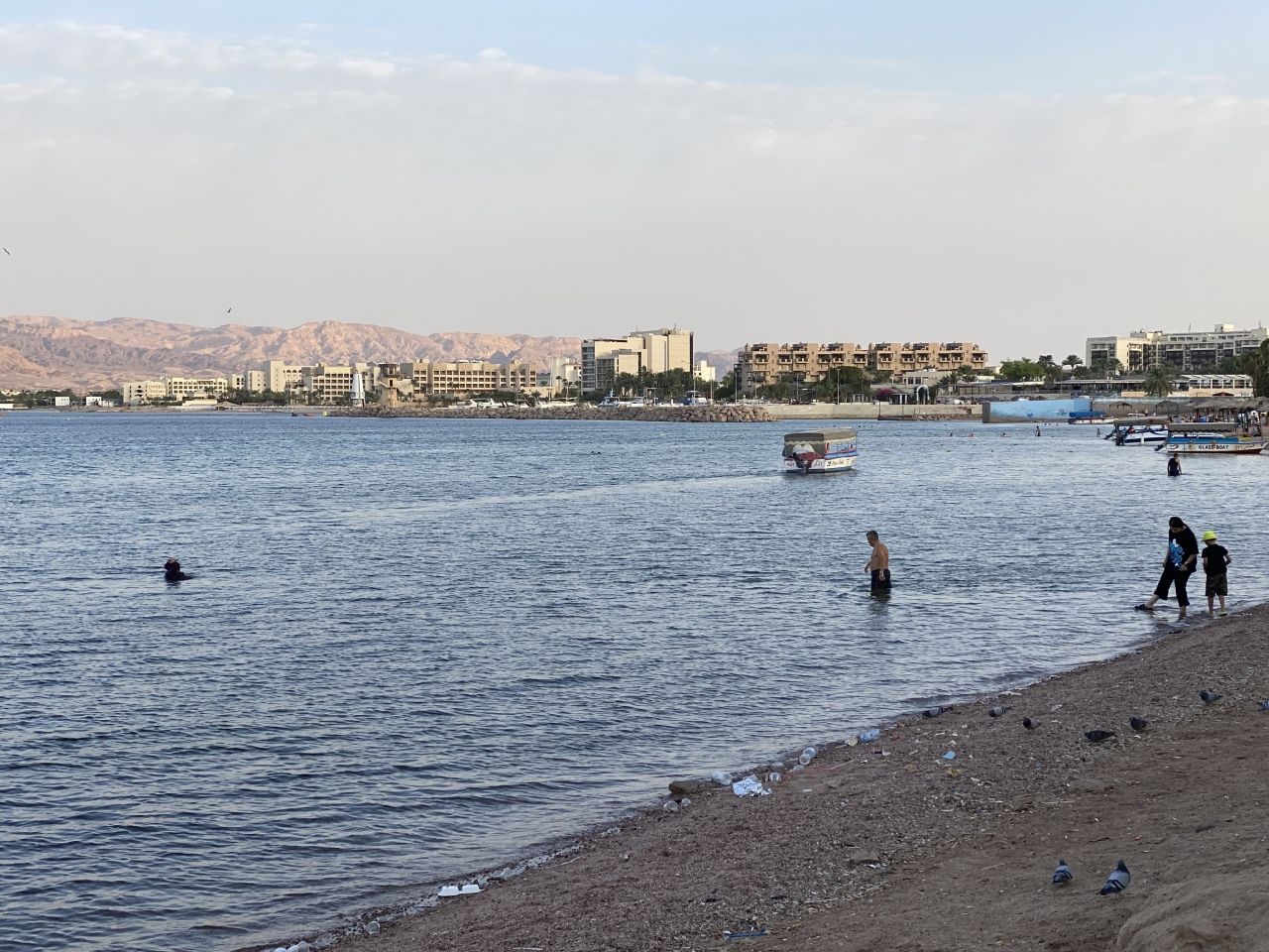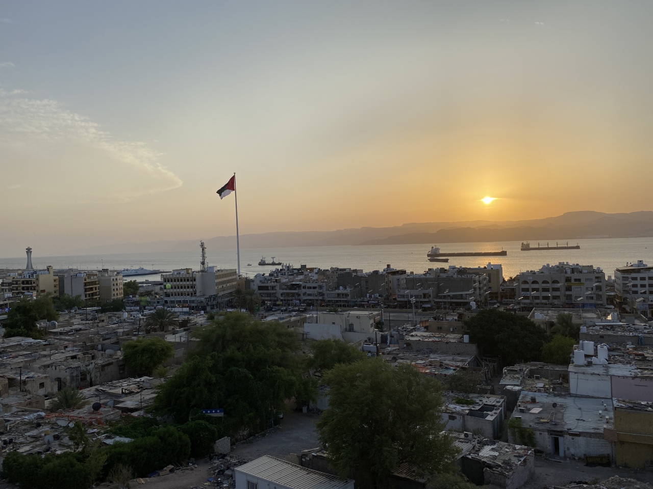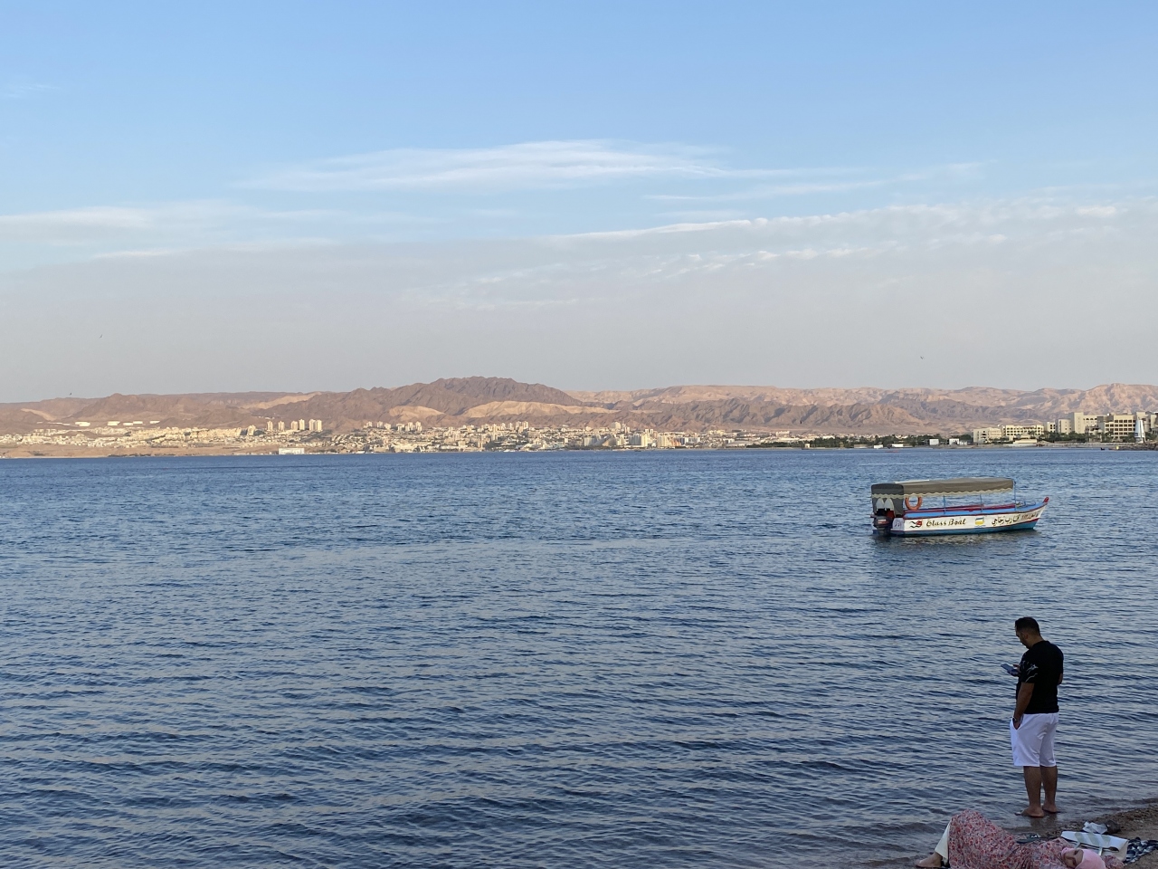 ヨルダン南部アカバにある湾で紅海になります。湾の先にはエジプトシナイ半島やイスラエルが見えています。