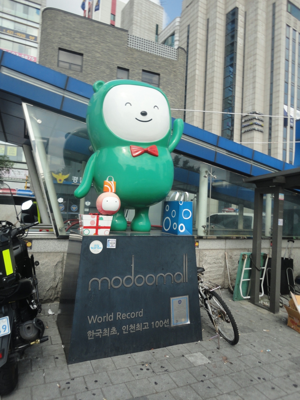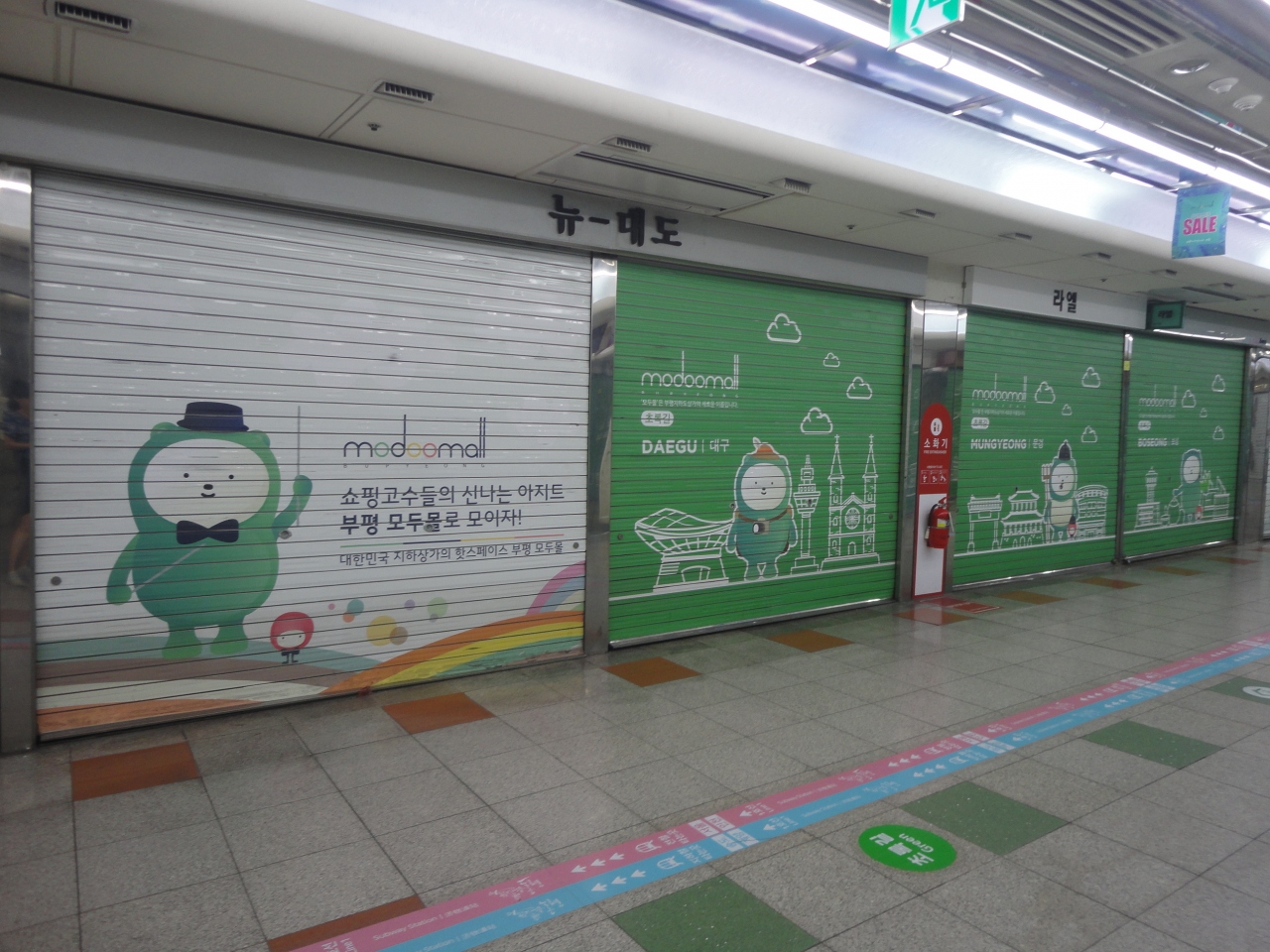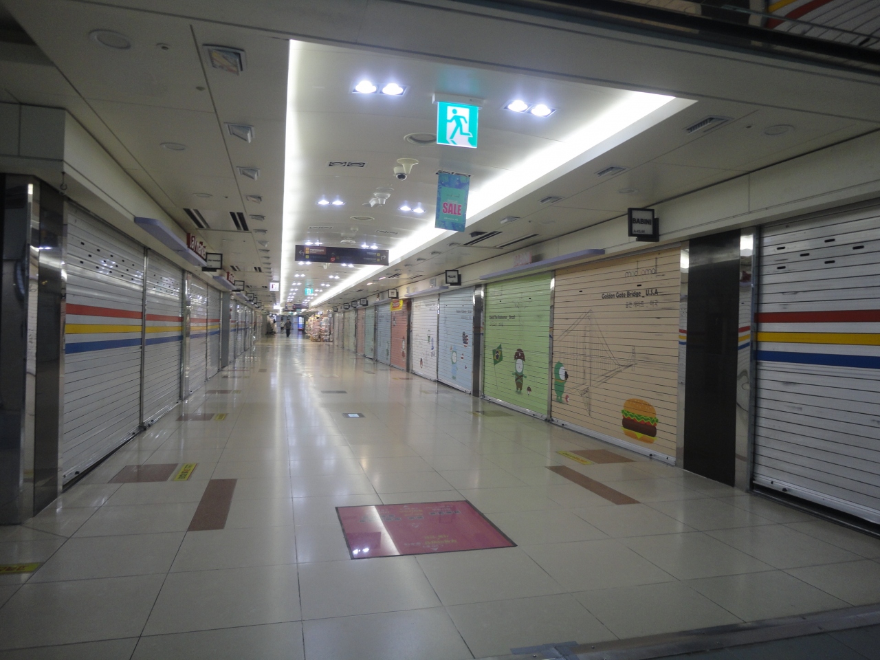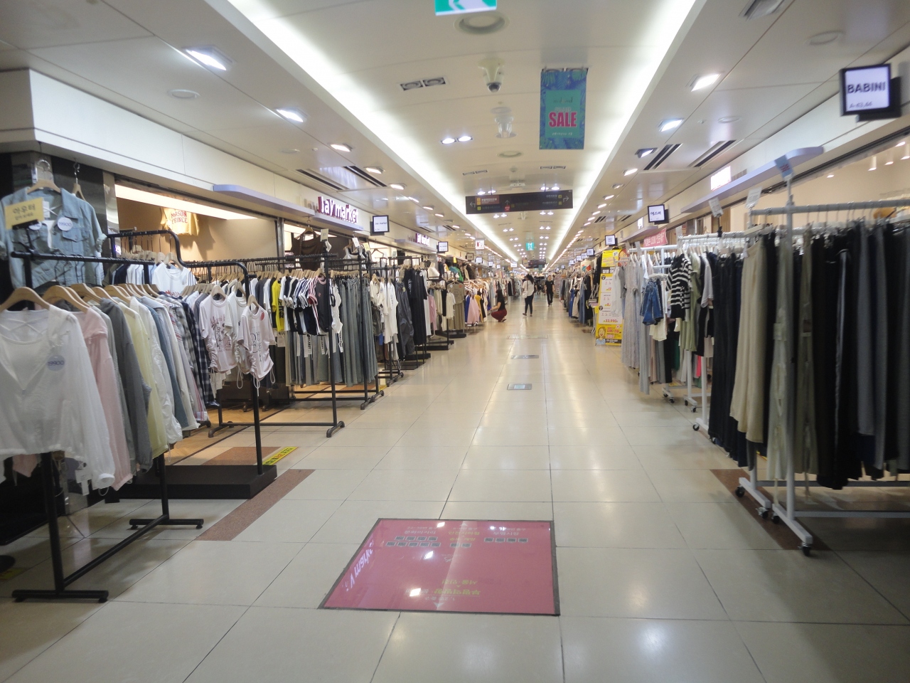 富平駅から北へ伸びる地下商店街です。激安ファッションのお店が多く並んでいて、コーヒーショップもちらほらありました。