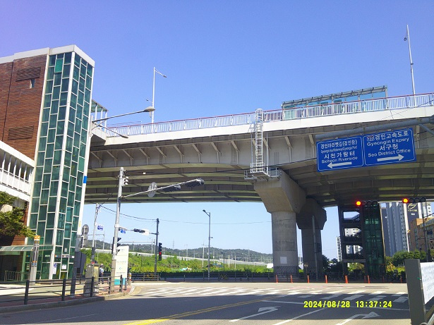 今回私は、この駅からバスに乗り換えるために利用しましたが、仁川地下鉄2号線もこの辺りは地上走行になっているのに加えて、この駅のバス停も高架道路上にあり、エレベーターでバス停に向かうのがユニークなレイアウトになっています。