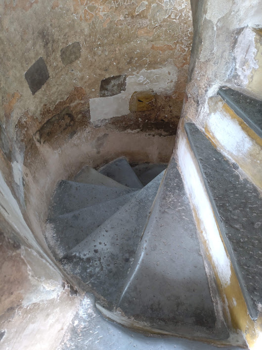 狭い石の螺旋階段には手すりもなく、なかなかにスリリングなので、上から元気に子どもたちが走り降りて来た時は、壁にピタッと細ーくなって耐えるのみ。