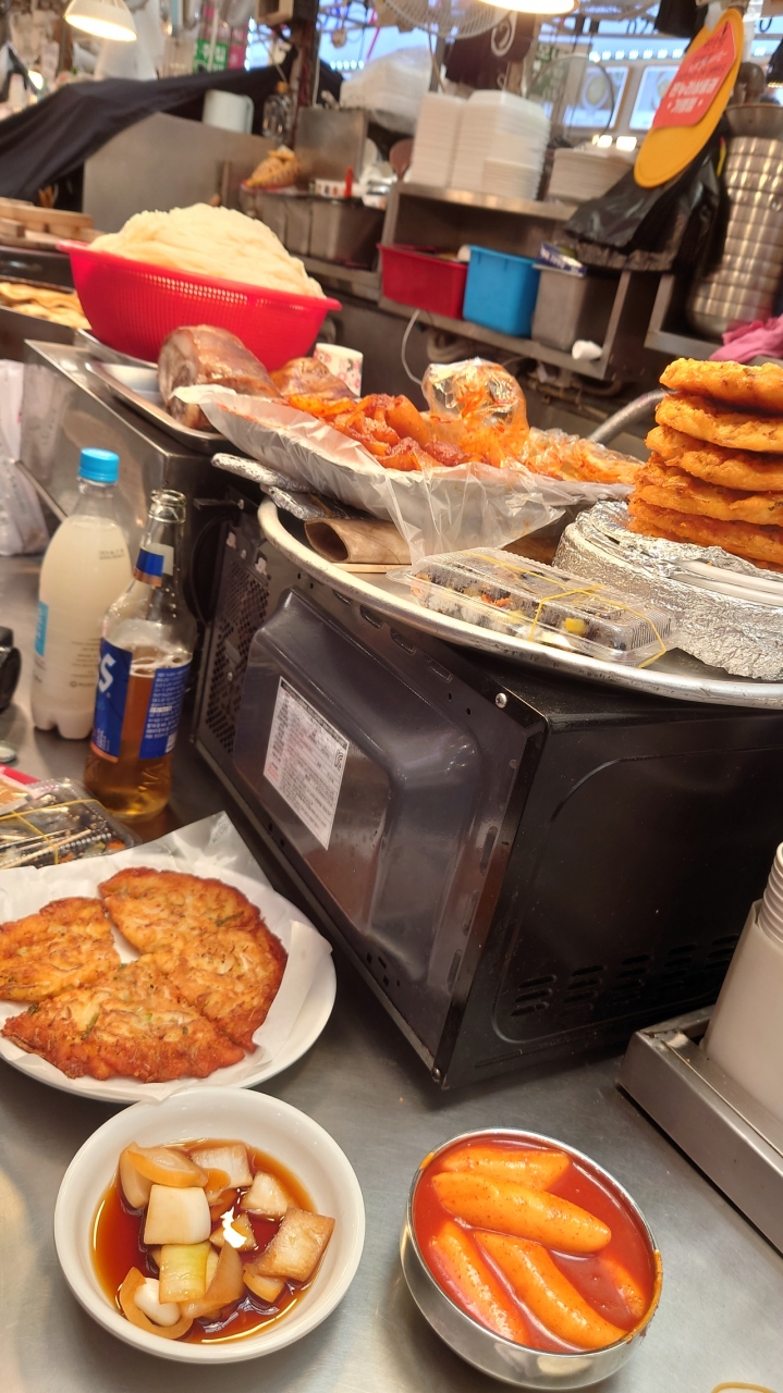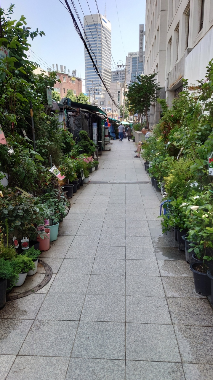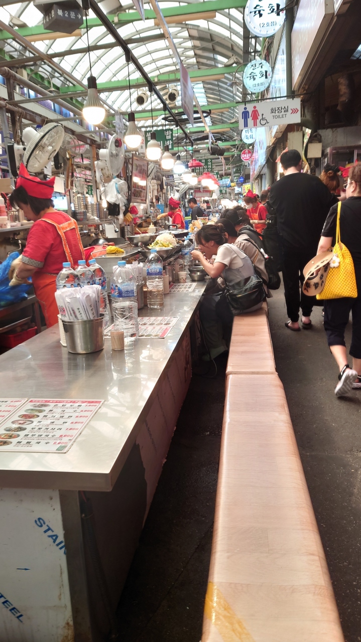 駅は鐘路5街駅のすぐの所にある有名な大きな市場です。市場内の飲食店や食べ歩きが人気です。初めは市場で食べ歩きや通路の長椅子に座って飲食も衛生的に大丈夫かとか、ぼったくられるとかも聞いて不安でしたが、通路の屋台も近くの正統な飲食店が出しているものがほとんどで、店はなかなか人気の有名店もあり衛生的にも問題はないようでした。屋台と言うよりちゃんとした市場内の飲食店でした。ぼったくりも規制が厳しく今はほぼないそうです。私も伺った店は良心的で格安でお腹いっぱい飲食しました。通路以外の周りにも服飾関係の生地や小間物を売っている店が多くゆっくり見るとすごいお買い得のものがありそうです。もっと外側の道路沿いには花や植木などの問屋さんもズラッと並んでいてなかなか楽しい