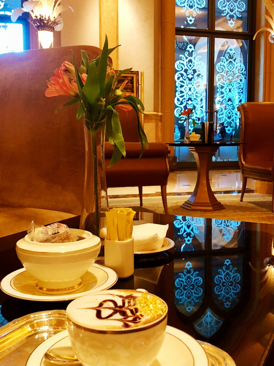 世界的にも有名なホテルの中にあるカフェ。金箔をふんだんに使った7つ星ならではの豪華さを感じさせるコーヒーが名物。一応行く前に連絡をしておきました。豪華といっても、落ち着かないような派手さはなく、ゆったりとした時間を過ごせました。