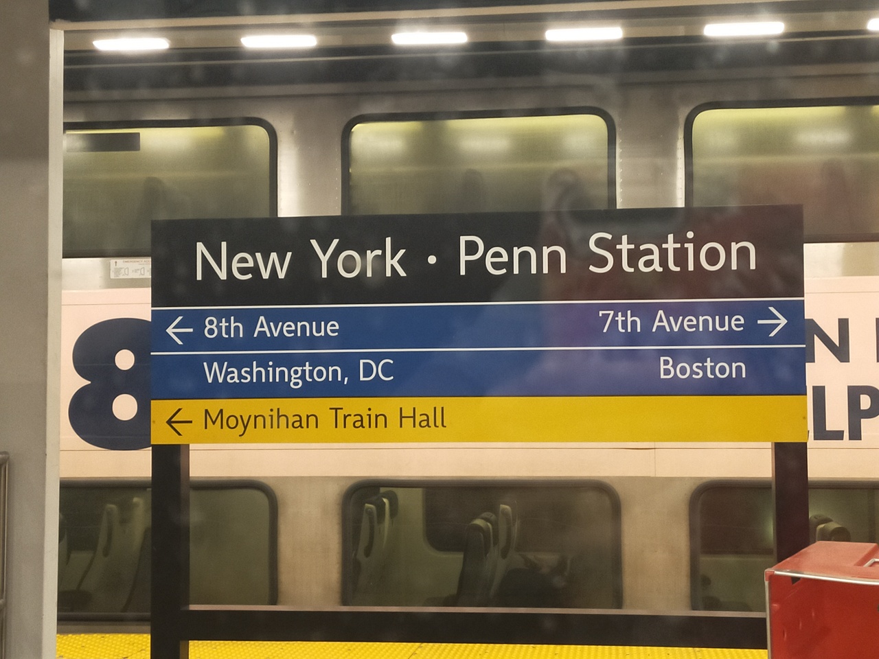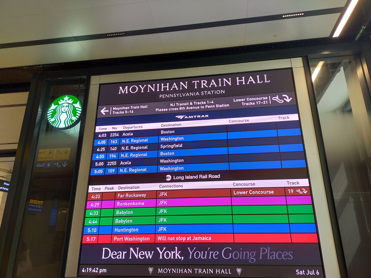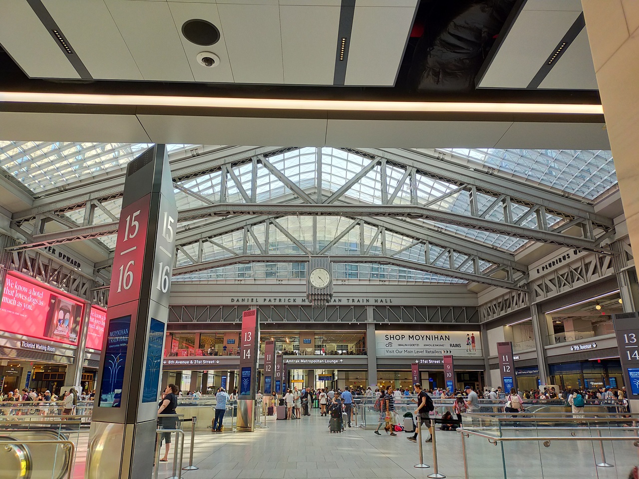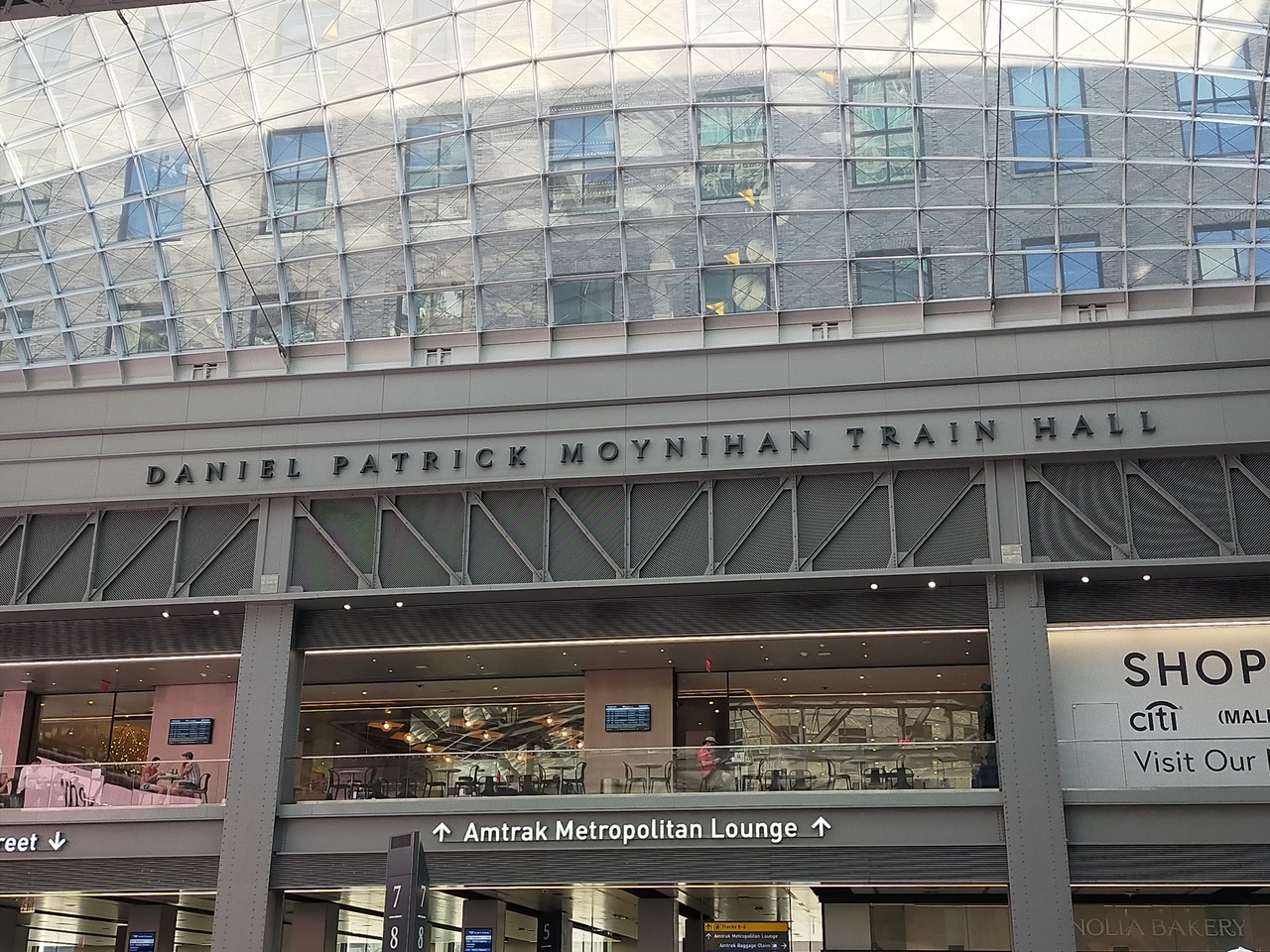アムトラックだけでなく、ロングアイランド鉄道も発着する駅。郵便局を改修し2021年に完成したモイニハントレインホールは、ガラス張りの天井から陽が差し込み、明るいフードコートには色々なお店があります。発着案内の電光掲示板も見やすく、各ホームの数字も大きくわかり易いです。