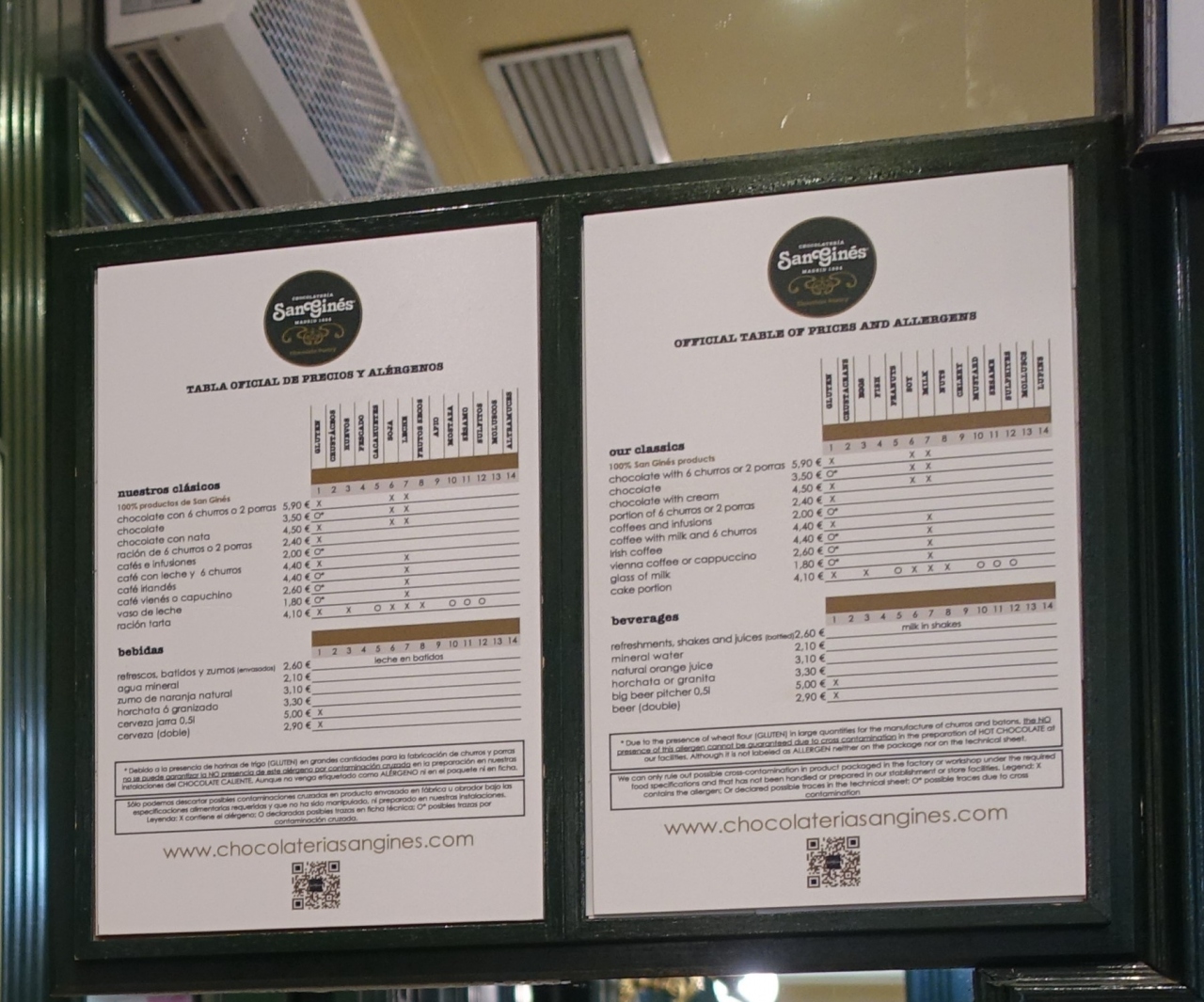 ホットチョコレートのみ3.5ユーロ、チュロスのみ2.4ユーロ、コーヒー2ユーロ等