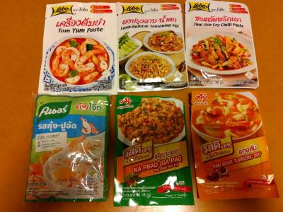 タイ料理のシーズニングが迷うほどに沢山売られていました。ガパオやトムヤムクンの素などを購入。