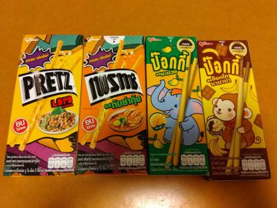 日本のドラッグストアがバンコクにもありました。日本で見るスキンケア製品なども売られていますが、ここでは、プリッツとポッキーを購入しました。プリッツはラープとトムヤムクン、ポッキーはマンゴーとバナナ味。バラマキ土産にもおすすめです。