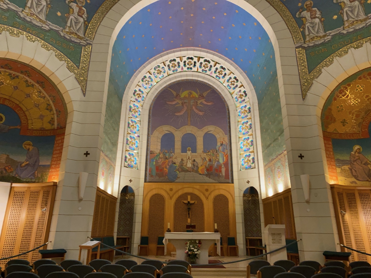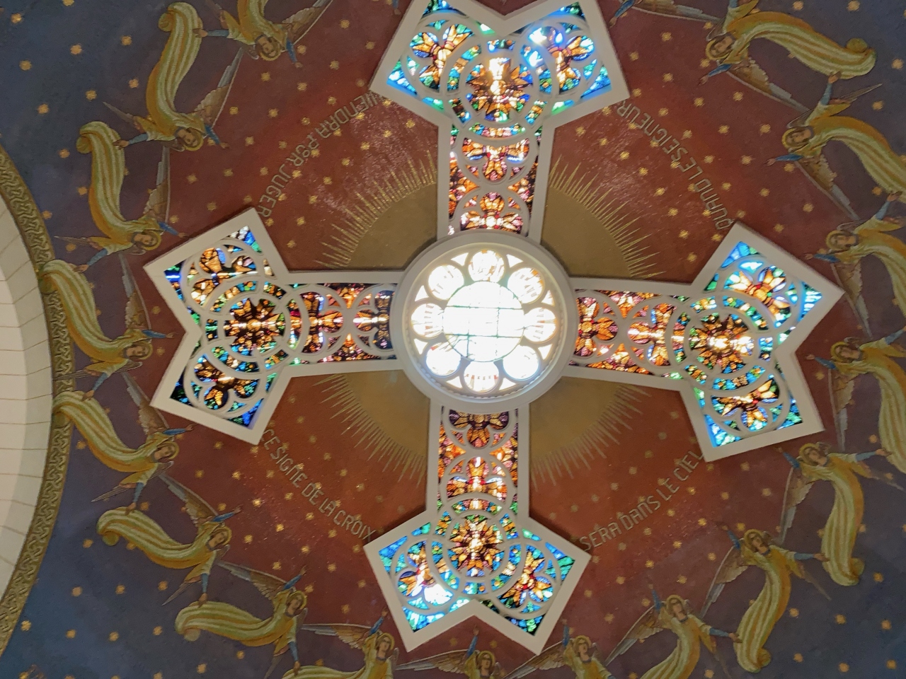教会内部は、ブルーを基調としてとても美しく、特に十字架を象ったドームのステンドグラスは、まるで計算されたかのような美しさです。