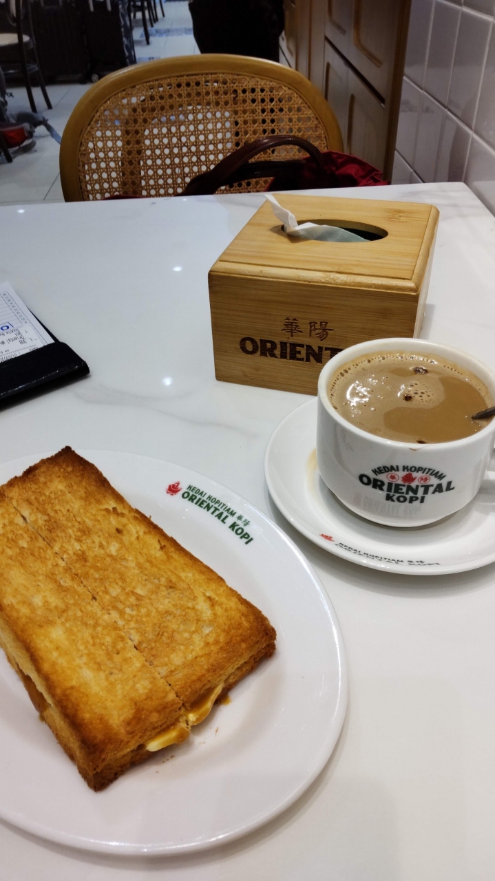 フード系も充実しています。写真はOriental Kopiのカヤトーストとホワイトコーヒーです。こちらのお店は人気のエッグタルトを買い求める人たちでいつも賑わっています。
