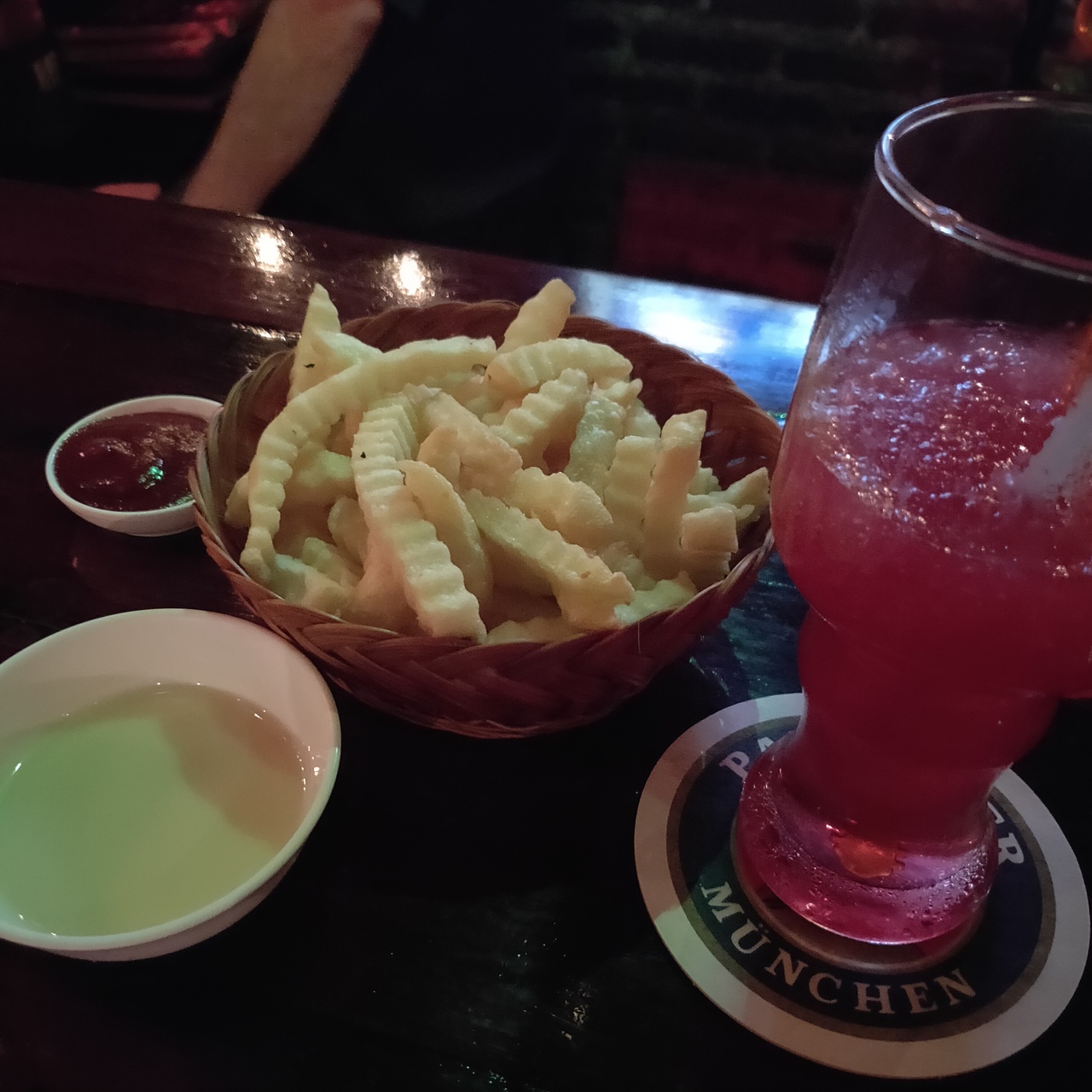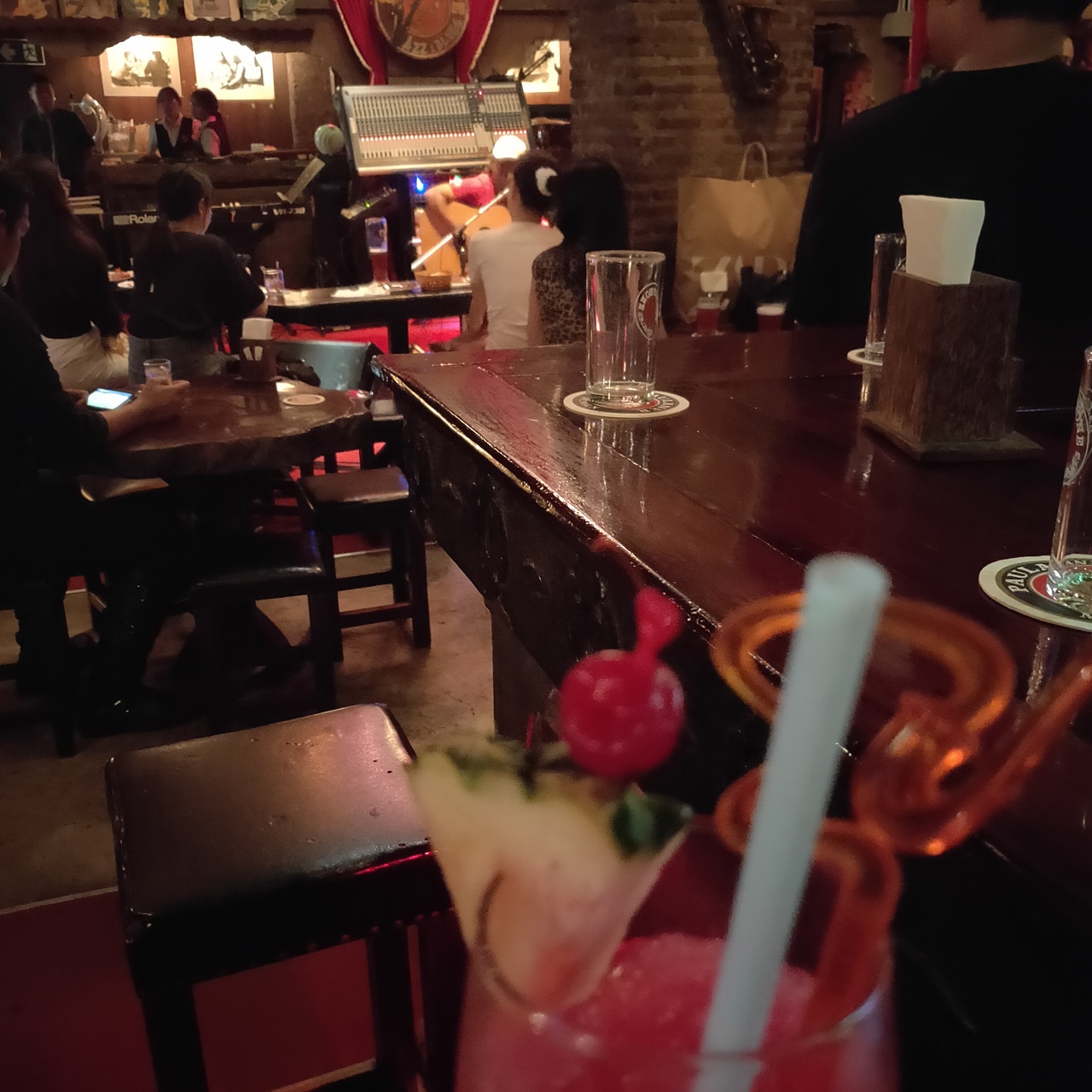 タイのジャズ事情に興味があり女ひとり旅で行ってみました。予約なし。おひとり様は皆さんカウンターを案内されます。19:30過ぎでカウンター席はまだ余裕ありましたがテーブル席は満席。その時間はアコギのフォークソングの演奏で、とても心地よい音楽が流れていました。雰囲気に負け、ビールが安いのについお高いカクテルを。それとポテト。音楽と雰囲気込みで大人には居心地の良いお店。英語も通じます。