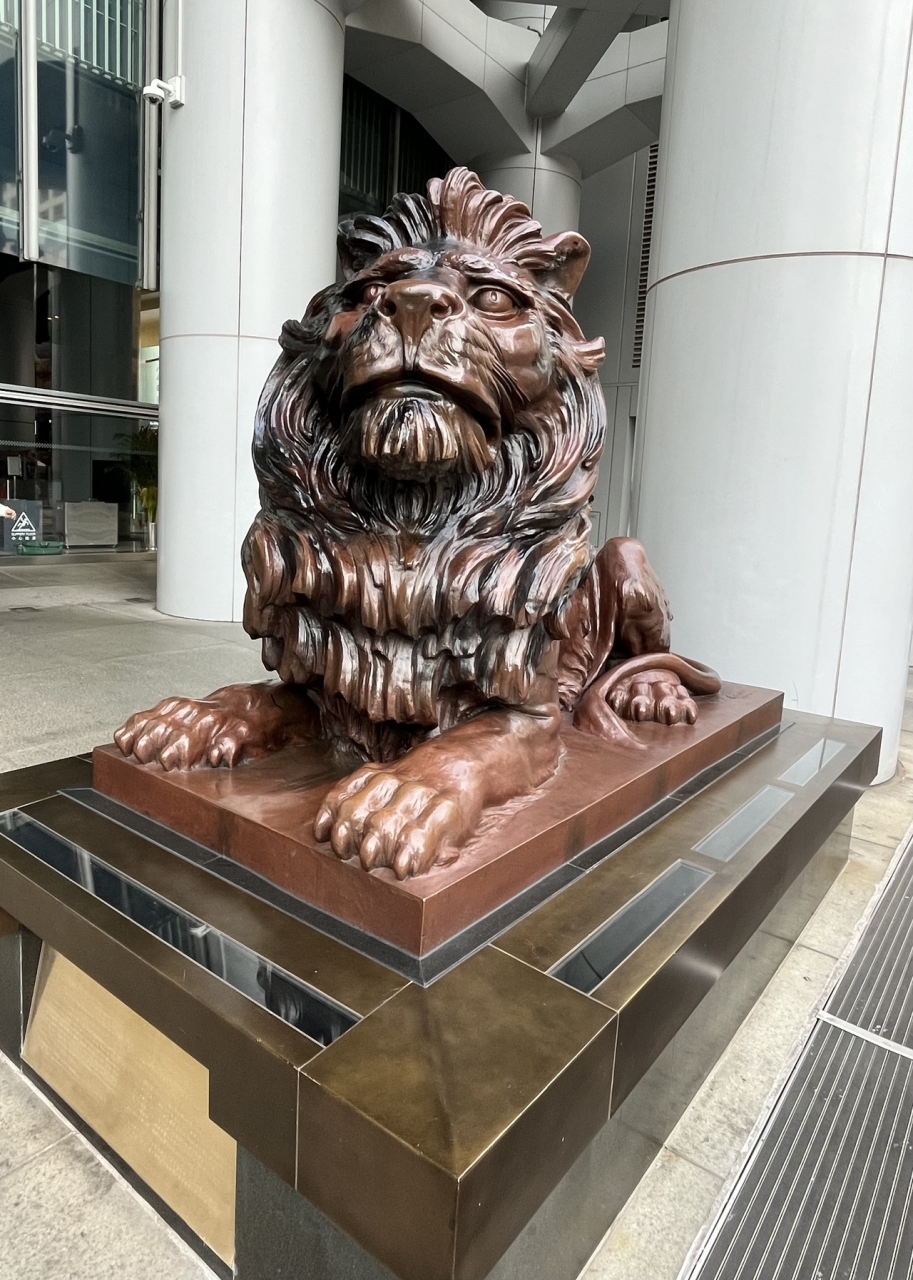 良いエネルギーが流れる龍脈の上に立つパワースポットな銀行。気の流れの通り道として1階部分が大きな吹き抜けに。2頭の獅子像は我が家にとってはお守り的存在。運気を取り込む口を開けた獅子と運気を溜める口を閉じた獅子に会いに香港に行っているといっても過言ではないかも。