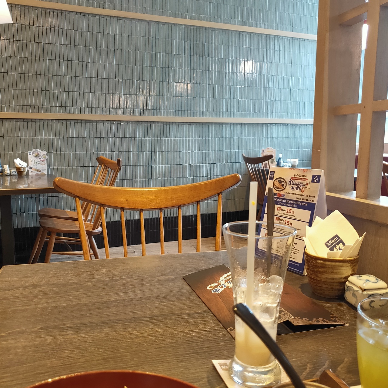 暑くて、疲れて、タイ特有の辛いもの甘いものも胃が受け付けず、そんなときに助かるのは日本食のお店。普段日本ではあまり行かないのに海外では貴重ですね。今回もとても救われました。まず冷茶がお代わり自由。というかコップが空いているとすかさず店員さんが注ぎにきてくれます。コップも大きい(涙)そして辛くも甘くもない、日本人好みの味付け(涙)あのいつもの食事がこちらで味わえます。社員教育も日本流なのか、地元のお店とは違い丁寧で気配りの接客。ホッとします。椅子やテーブルも広々、お食事も美味しく、日本のお店の有り難みを感じながら過ごしました。本当に美味しかった☆