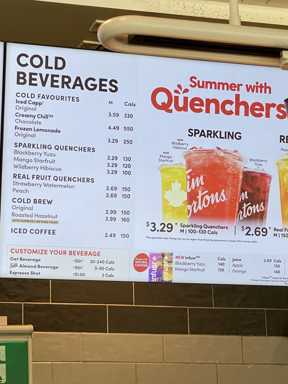 カナダで有名なコーヒーチェーンですが、コーヒー以外の飲み物も充実しています。今回はレモネードのスラッシーFrozen Lemonadeを頼んでみました。細かい氷の粒が飲みやすく、暑い日にピッタリでおいしかったです。