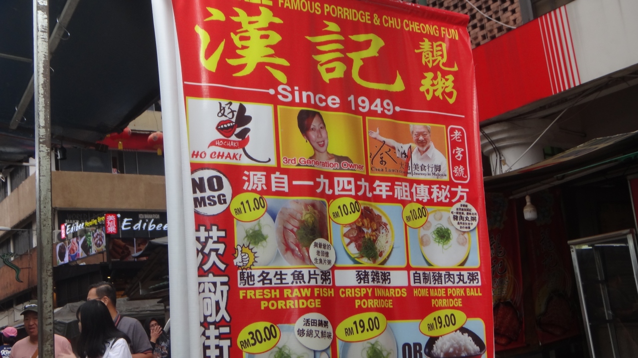 約10年ぶりの再訪。チャイナタウンのど真ん中。味も以前と変わらず絶品。ここも早朝から開店しているが昼間も混雑している。注文したのは前回と同じ猪雑粥で10RM。安くて美味い。今回ニャチャン・ジョグジャカルタ・KLと3都市訪問したが、B級グルメ好きとしてここのお粥が一番だった。尚隣にある持ち帰り用の焼きそば屋台も人気があり美味かった。