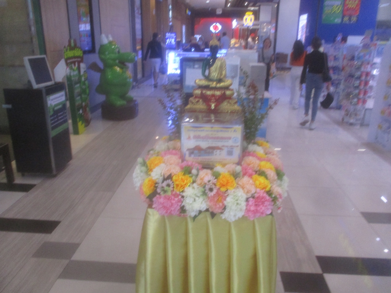 センチュリー ザ ムービープラザ オンヌットの2階にはタイらしく、献花に囲まれた金色の仏像が置かれていました。国民の90%以上が仏教徒であり、御供えものやタイバーツの紙幣を納めていました。買い物を終えたお客さんが熱心に参拝をしていました。