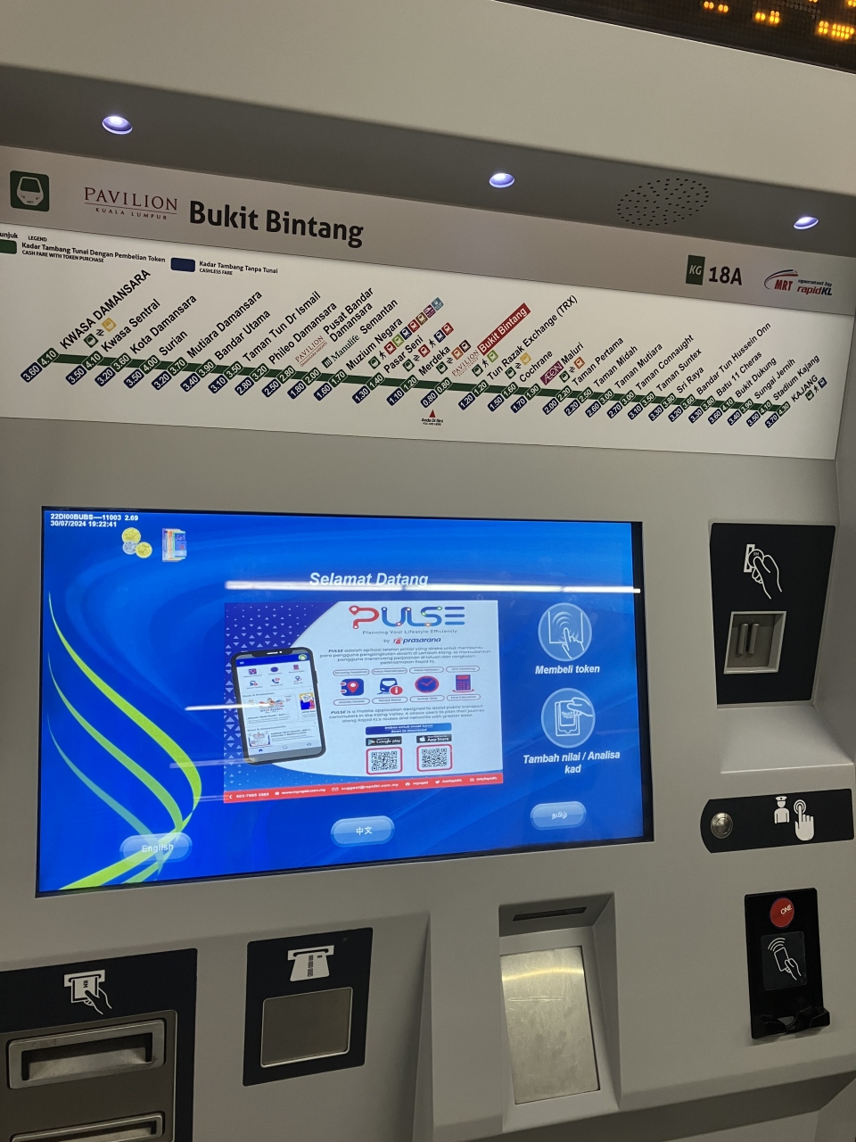 マレーシアの交通機関には、LRTやKLモノレールがありますが、MRTは比較的新しい乗り物です。プトラジャヤ線も開通しており、ブキッビンタンからアンパンパークまでの移動で利用しました。券売機では、クレジットカードは使用できませんでした。