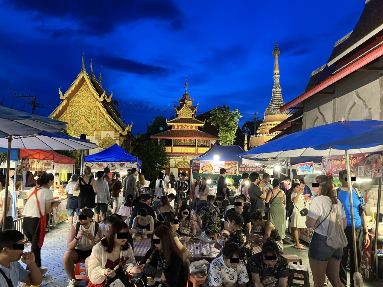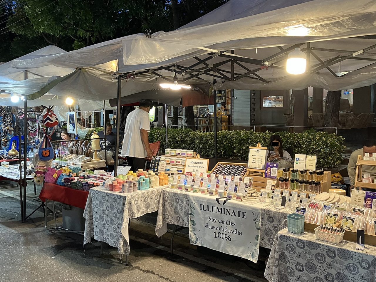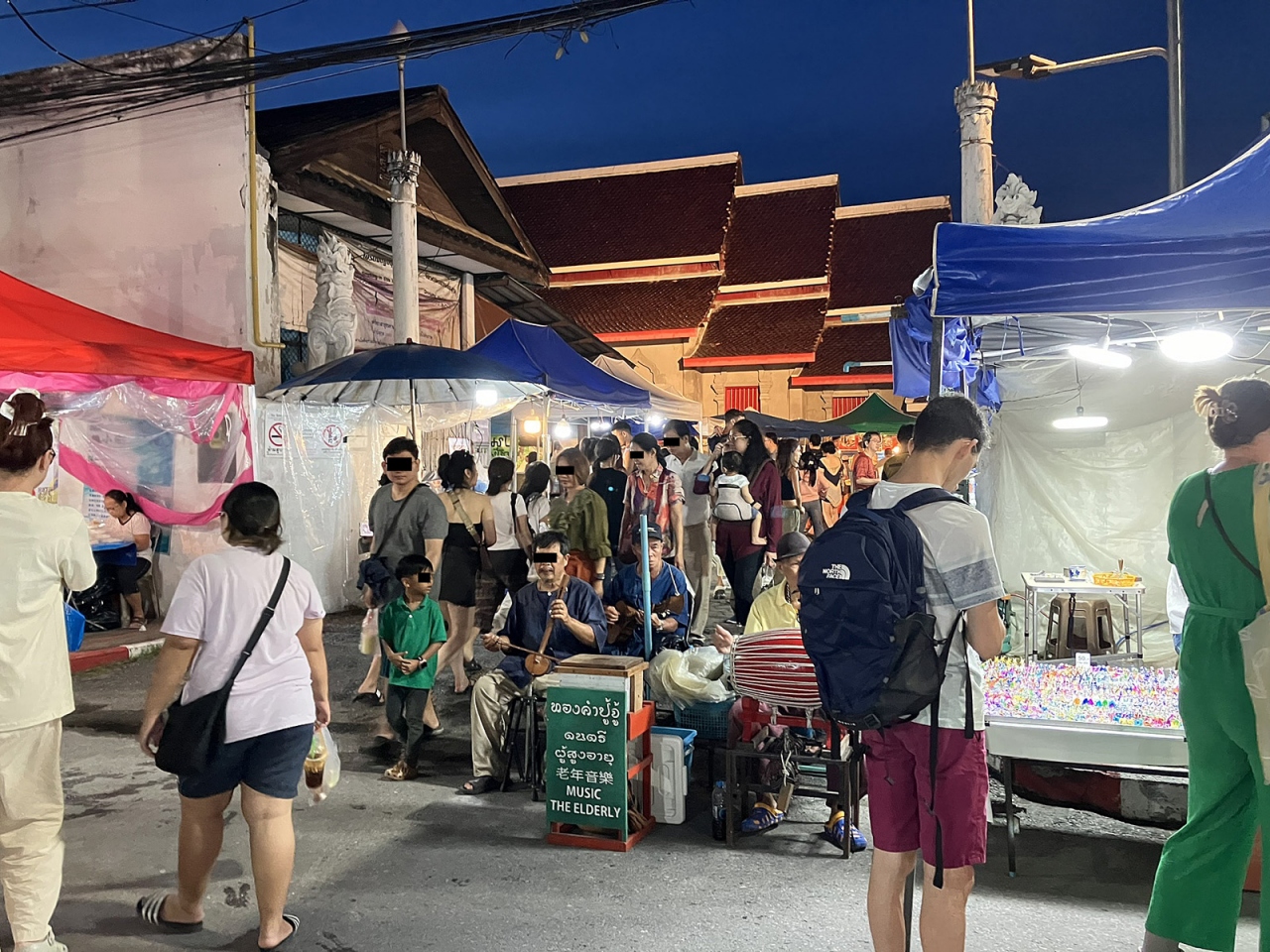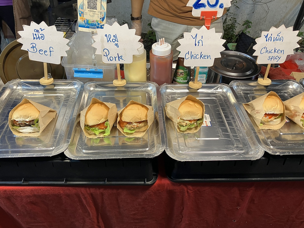 チェンマイを代表するナイトマーケットです。ターペー門からワット・プラシンま続く規模の大きさはもちろん、通り沿いの各寺院の境内もが解放されているのは素晴らしいですね。日本の仏教が江戸時代に骨抜きにされてしまったのとは対照的に、タイの仏教は市井のものであることを実感できます。また絵画やタペストリーなど芸術品も多いですし、身障者・学生などが楽器の演奏などで寄付を募っていたりしているのも、このマーケットの特徴だと思います。もちろん長期滞在者やタイ人も多く訪れるマーケットゆえ、チャンクラン通りのナイトバザールなどと比べると、値段も大きく違ってきます。今回私が購入したのはビーフバーガー25THB、かぼちゃプリン30THBと、値段もうれしいものです。寺院の在り方、身障者・学生の活動や芸術作品からタイの社会、もちろん値段の安さも、いろいろと楽しく勉強のできるマーケットです。