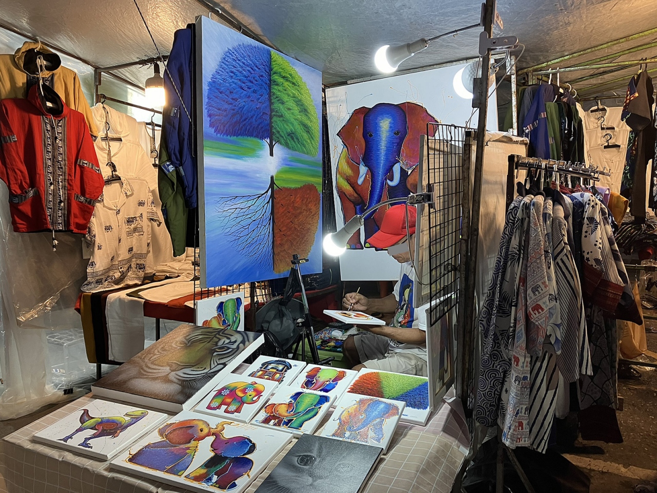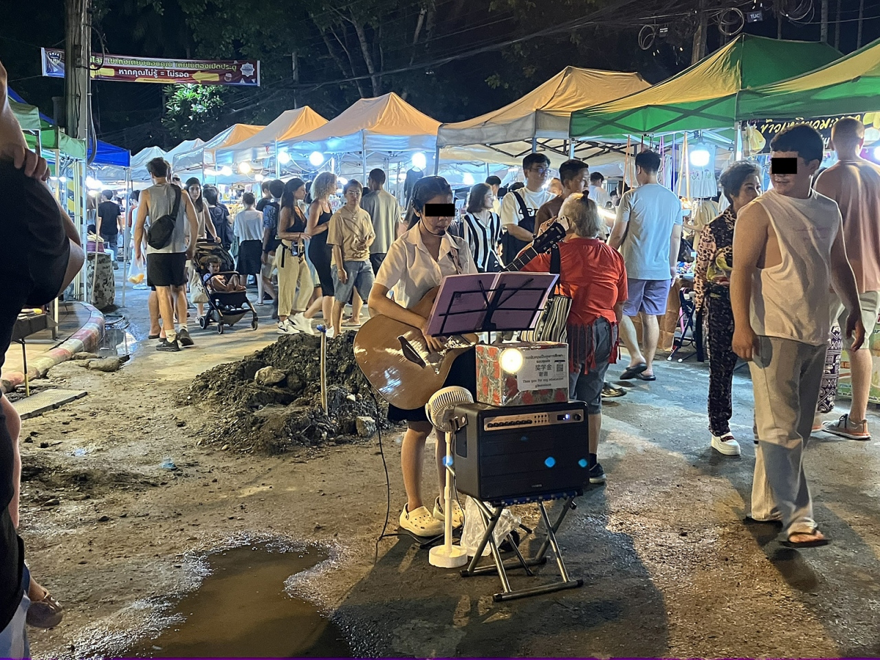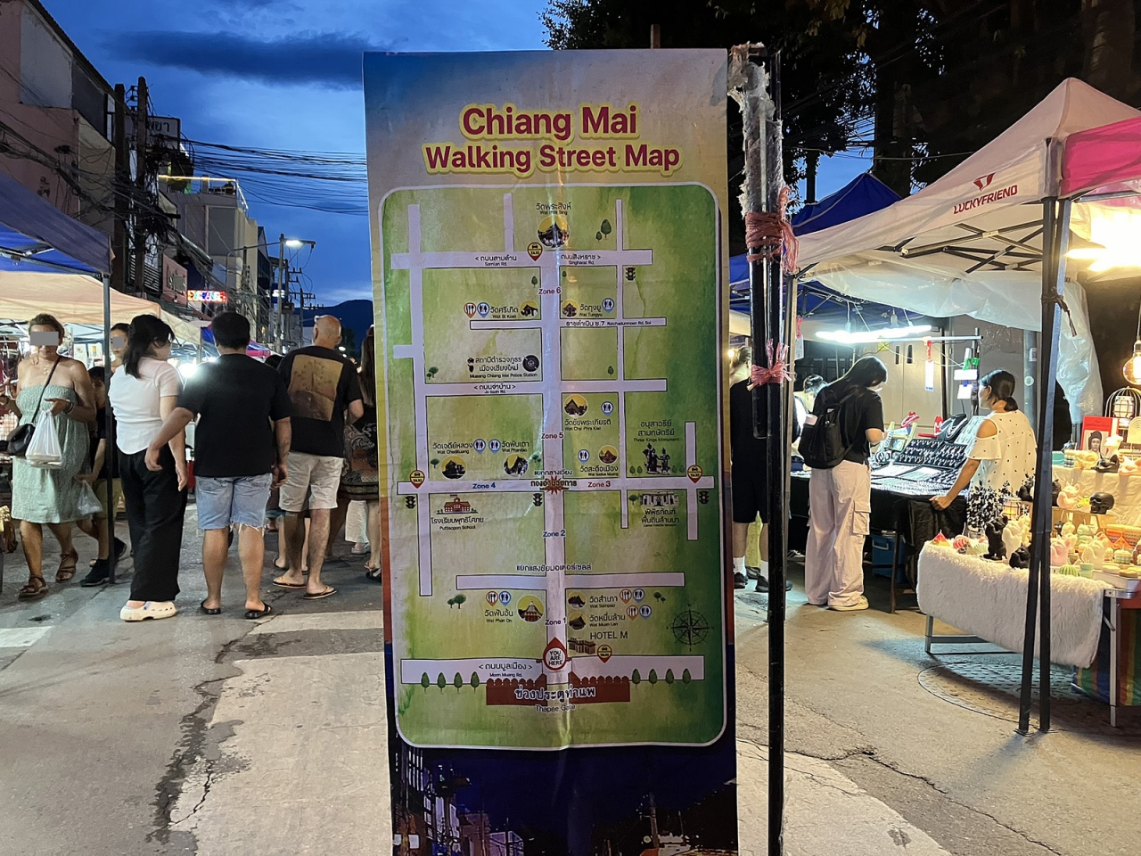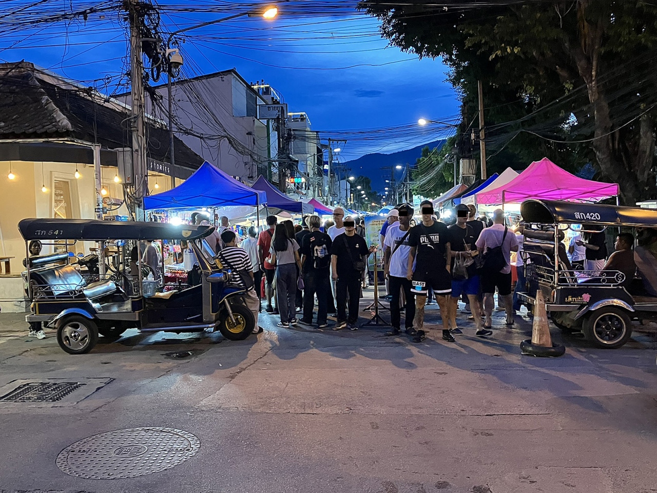 チェンマイを代表するナイトマーケットです。ターペー門からワット・プラシンま続く規模の大きさはもちろん、通り沿いの各寺院の境内もが解放されているのは素晴らしいですね。日本の仏教が江戸時代に骨抜きにされてしまったのとは対照的に、タイの仏教は市井のものであることを実感できます。また絵画やタペストリーなど芸術品も多いですし、身障者・学生などが楽器の演奏などで寄付を募っていたりしているのも、このマーケットの特徴だと思います。もちろん長期滞在者やタイ人も多く訪れるマーケットゆえ、チャンクラン通りのナイトバザールなどと比べると、値段も大きく違ってきます。今回私が購入したのはビーフバーガー25THB、かぼちゃプリン30THBと、値段もうれしいものです。寺院の在り方、身障者・学生の活動や芸術作品からタイの社会、もちろん値段の安さも、いろいろと楽しく勉強のできるマーケットです。