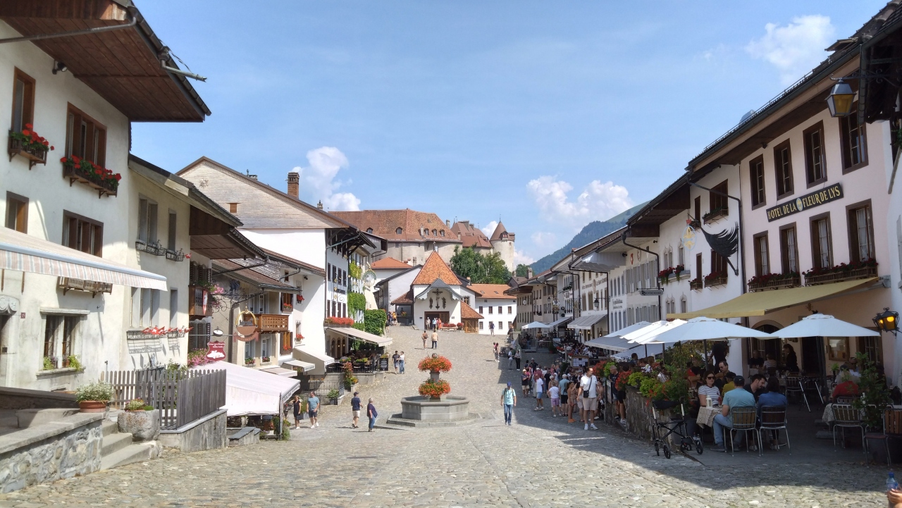 グリュイエールのチーズ工場に見学に行き、その後、15分くらい歩いて城まで行きました。城の手前の日本で言う城下町がとてもステキで、かわいらしいレストランや街並みがあって、とてもステキでした。レストランでラクレットを食べましたが、値段は30スイスフラン位と高かったですが、一人分を二人で食べても食べきれないほどありました。城は、スイストラベルパスで入場することができました。