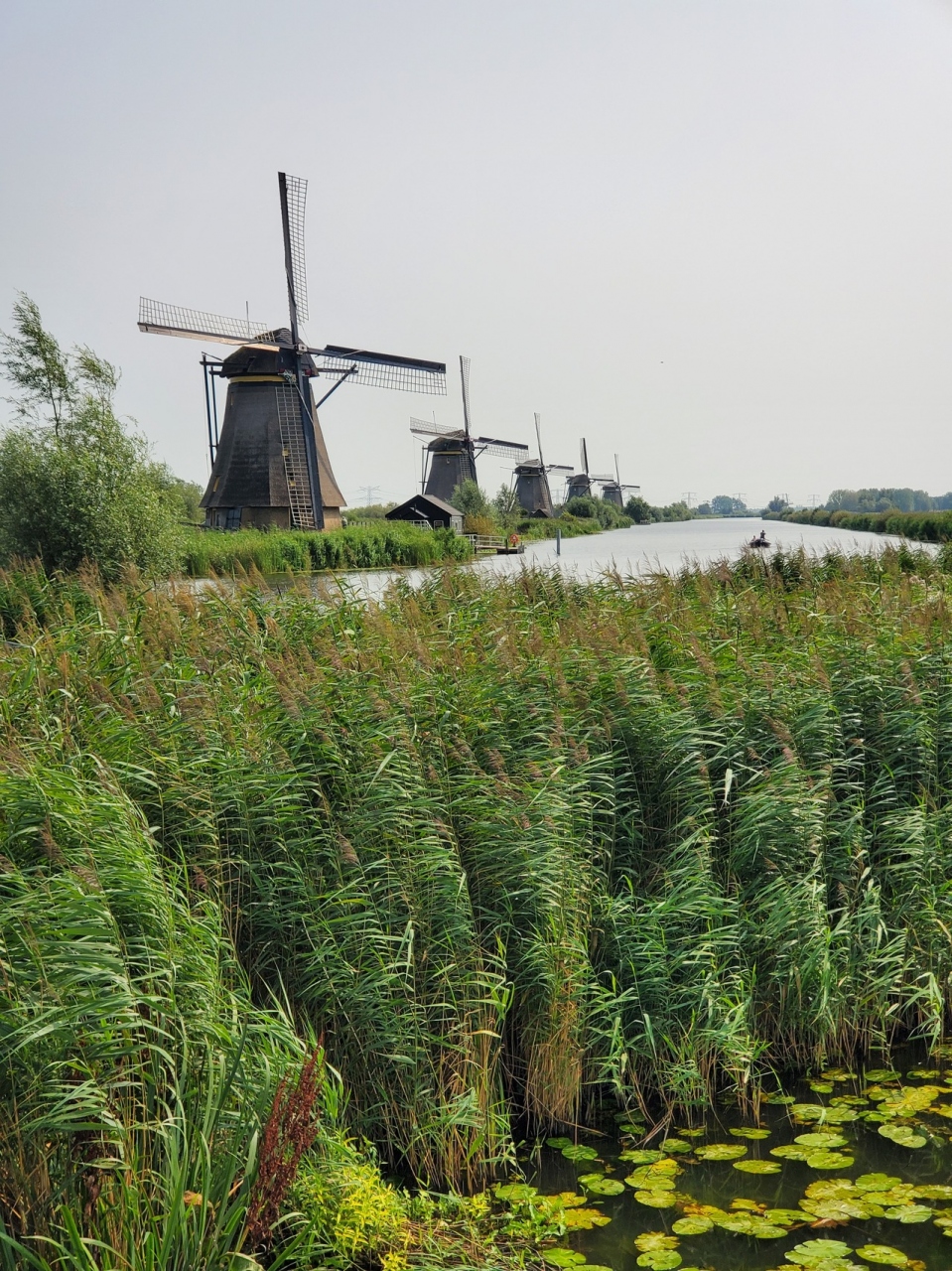 オランダらしい風車の並ぶ風景が並ぶ、ロッテルダムからタクシーはもちろんトラム+バス、バス一本、船なのどアクセスが多彩、宿泊場所からの近さで選ぶといいでしょう。サイクリング客の自転車がけっこう危ないのでお気をつけを。