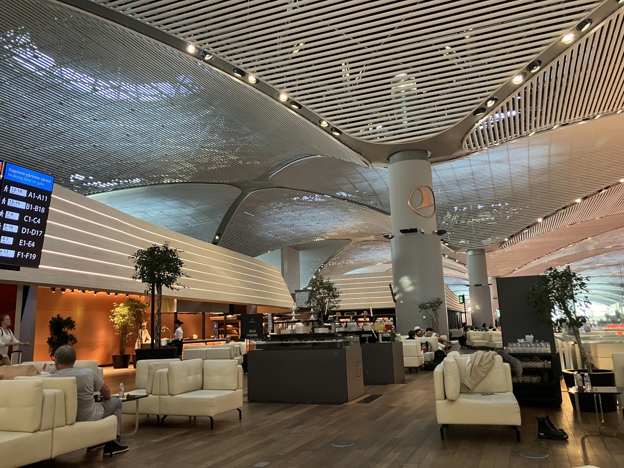 イスタンブール空港はラウンジが2つあり、内容はどちらも同じですが、こちらはビジネスクラス利用の利用者専用のラウンジのようです。セキュリティゲート抜けて右手に5分くらいすすんだところにあります。中はとても広く、人も多いですが、席に困るようなことはなかったです。温かい食事はライブキッチンで作られており、パンも焼き立て、トルコ料理の前菜も20種類くらいあり、お酒やジュース、デザートも豊富でした。