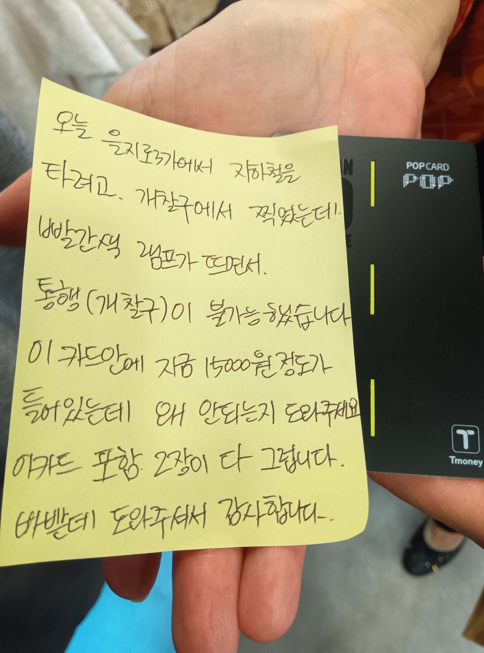 前日の地下鉄のトラブルで、地下鉄駅に入場したけど、乗車せずに引き返した為、私達の使用中のT-moneyカード(日本のSUICAやPASMOのようなもの)とWOWPASSが使えずに困ってスタッフさんに相談した所、忙しい時間帯にも関わらず、拙い韓国語&英語を聞いて、駅員さんが分かるように、このような丁寧なメモを書いて下さいました。ずっと笑顔で対応して頂いて、本当に助けて頂きました。