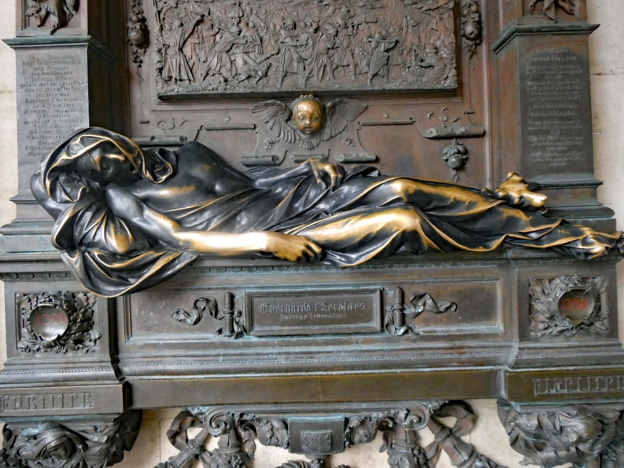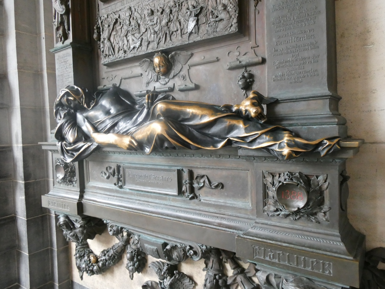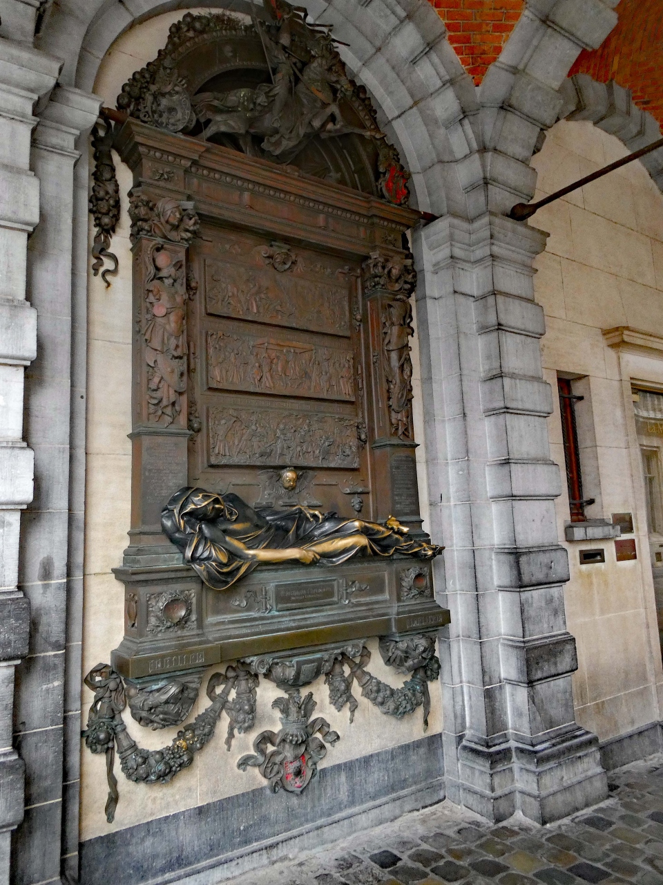 「セルクラースの像」で、セルクラースは、14世紀、フランドルの攻撃からブリュッセルを守った英雄。彼の像に触ると願いが叶うとの言い伝えがあるそうです。像の右手や足の部分、多くの人が触ったようでピカピカでした。像の台座に彫られている「1320?」と「1388」は、セルクラースの生年と没年と思われます。