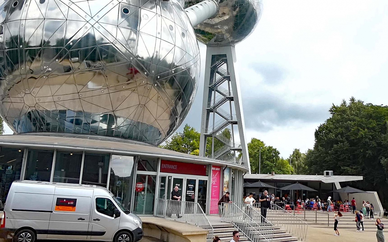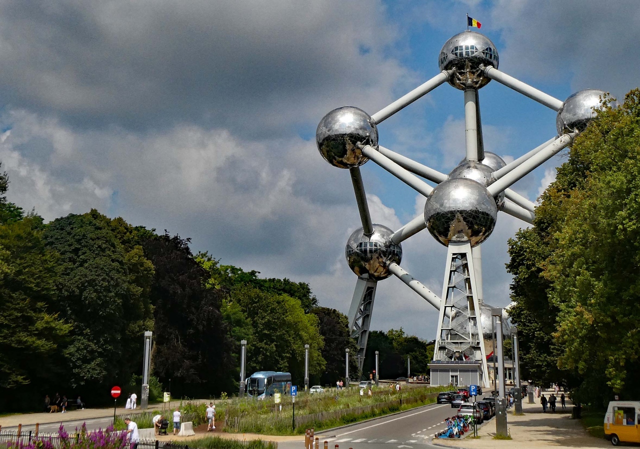 アトミウムは、ブリュッセル郊外にあるラーケン公園の北西端にある巨大なモニュメントです。ブリュッセル中央駅からアトミウムまでは約10kmで、公共交通機関を利用すると乗り換えや徒歩を含めて40分ほどかかります。大きな駐車場があるので、車で来られる方も多く、また近くにヨーロッパの名所をミニチュアで再現した「ミニ・ヨーロッパ」もあります。家族連れやカップルの訪問者が多いように感じました。