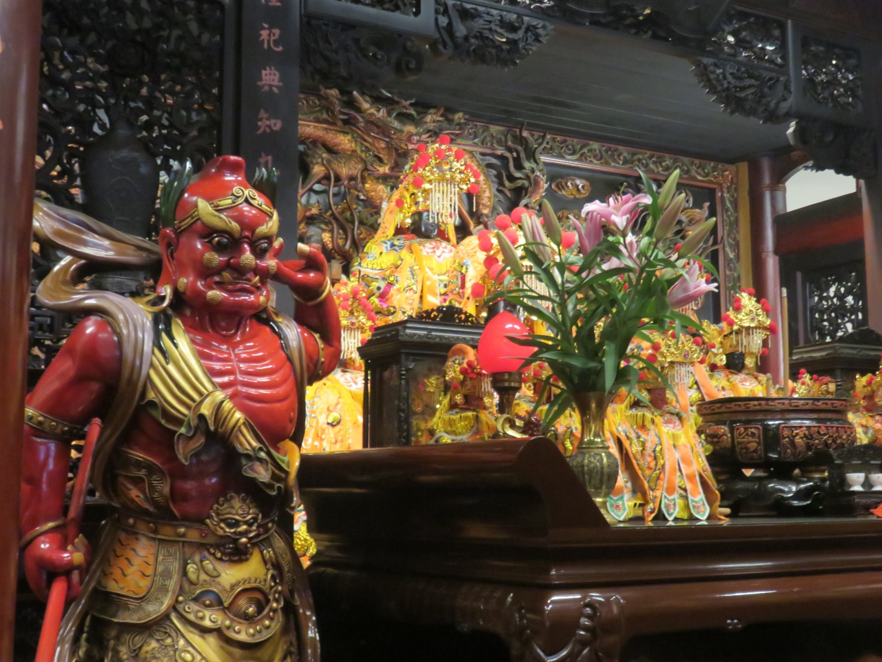 台中市内に立つ最も古い寺院の1つで、本堂には、寺院の創立から作られた老大媽、嘉慶時代の老二媽、光緒時代の聖二媽と聖三媽、戦後の聖老二媽など、さまざまな時代に作られた媽祖の像がいくつかあります。後部ホールは中央の観音に捧げられており、左側に関羽、右側に神農が並んでいました。