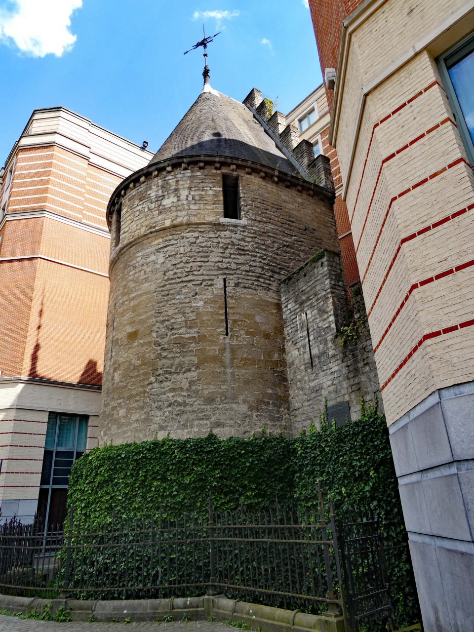 新造ビルに囲まれた形で保存されている「黒い塔」、茶褐色系の石を円形状に積み上げて造った塔で頂部が三角形の褐色屋根で覆われていました。黒というより茶褐色の塔、13世紀初頭に建造された要塞の一部であり、ブリュッセルに残っている古い史跡(Historical Monument)として登録されているそうです。塔に付属した要塞壁の一部も残されていました。