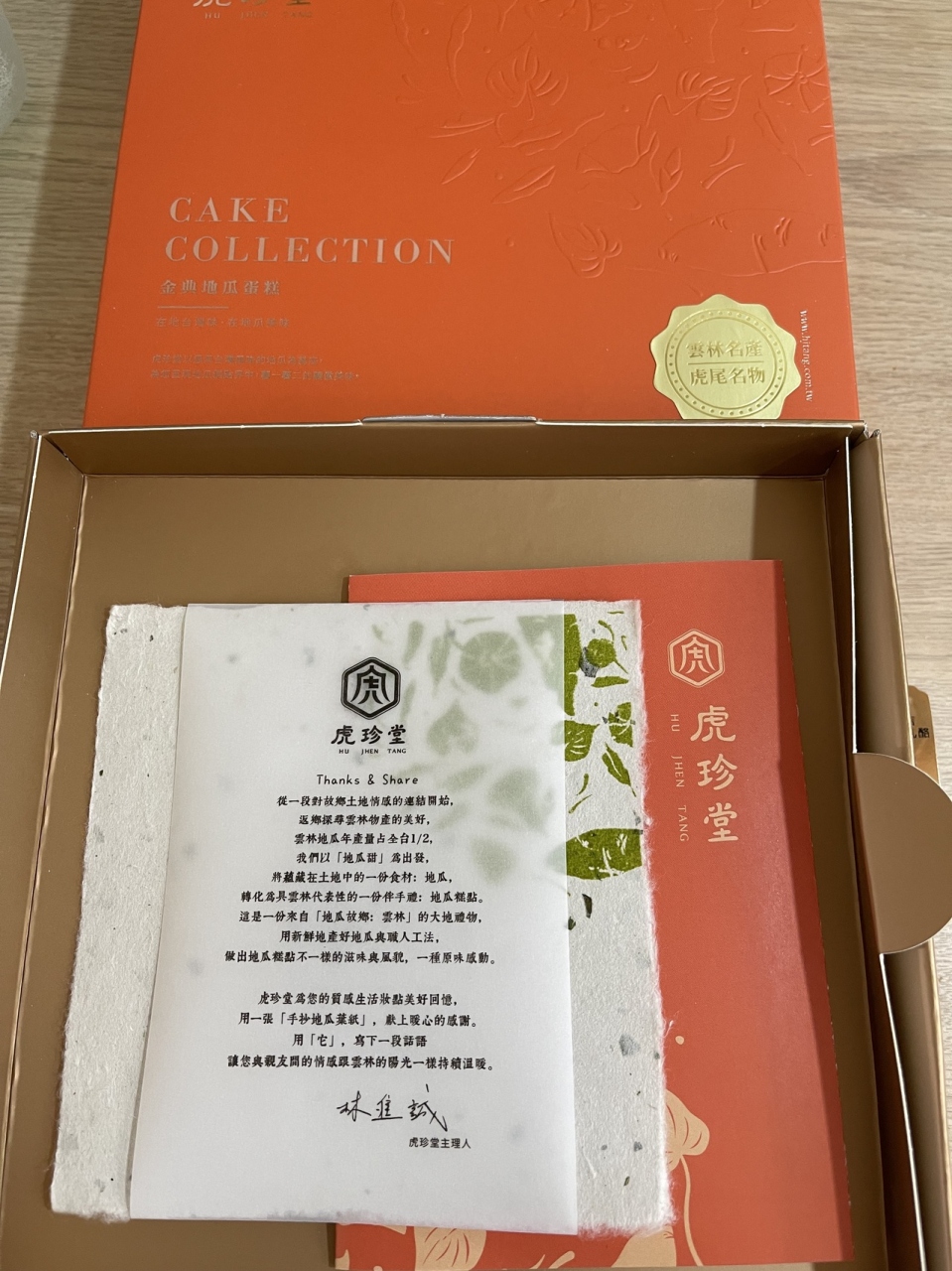 虎珍堂はレシートが出ました。虎珍堂で買ったケーキは立派な箱に入っていて、おしゃれなすき紙に説明が書いてありました。オレンジの箱が鮮やかでした。味は自然体で、そこまで甘すぎず、じゃっかんヘルシーな感じがしました。