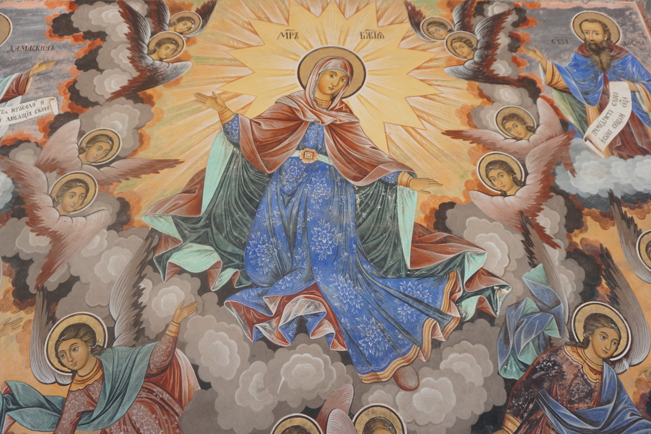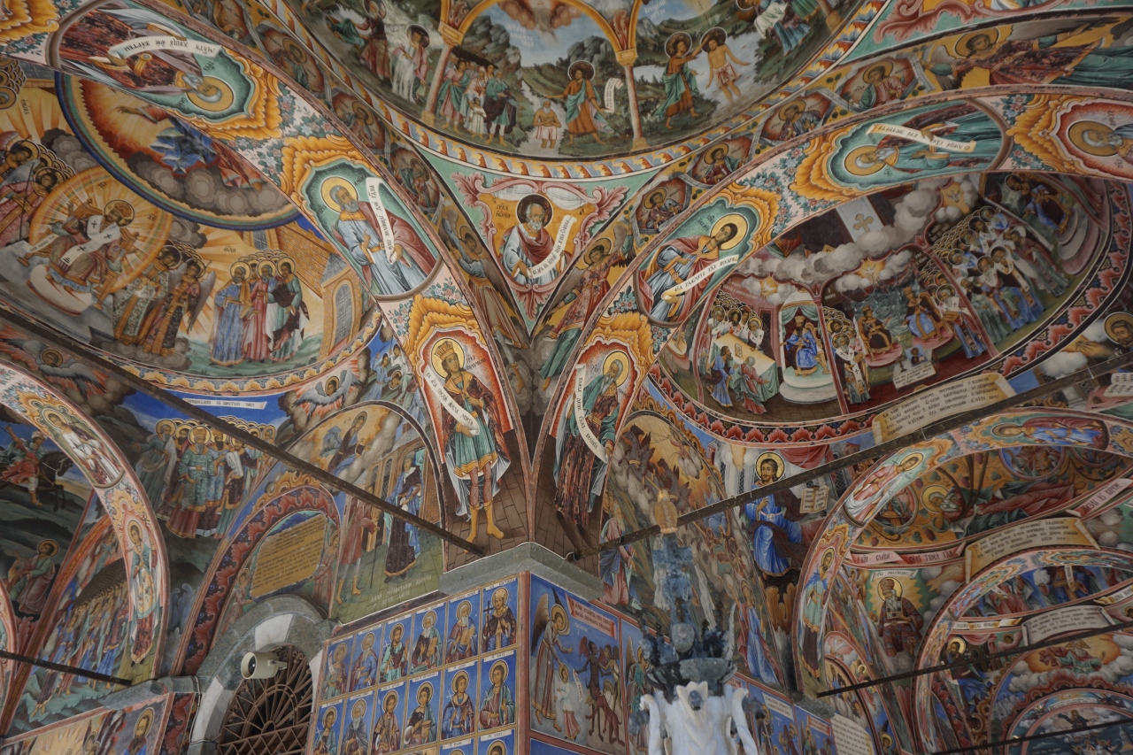 聖堂の周りのフレスコ画は美しく圧倒的でした。イコン画には聖人や天使の他、聖書の中の出来事やたとえ話が多く描かれています。平坦な壁だけでなくあらゆる方向に沿ったアーチに、隅々まで聖書の中の人物が数多く登場します。