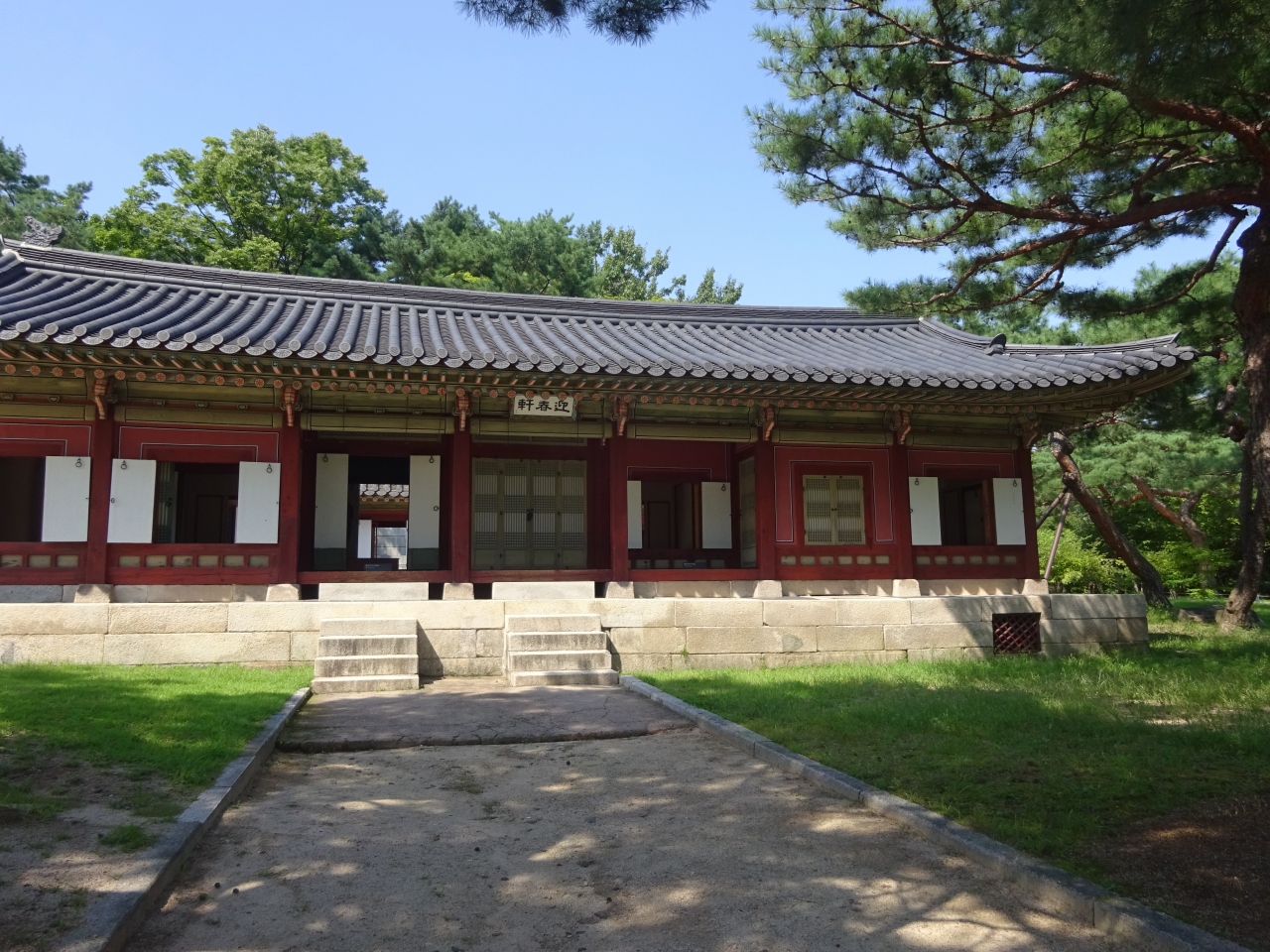 ソウルの迎春軒です。昌慶宮の中にある建造物です。まず、昌慶宮の北側の森の中の道や池等を見た後に、東側からおりてきて、まず見えてきたのが、こちらの迎春軒でした。集福軒と繋がった建物のようです。着色がされているような、いかにも韓国らしい建物では無いですが、美しい佇まいです。