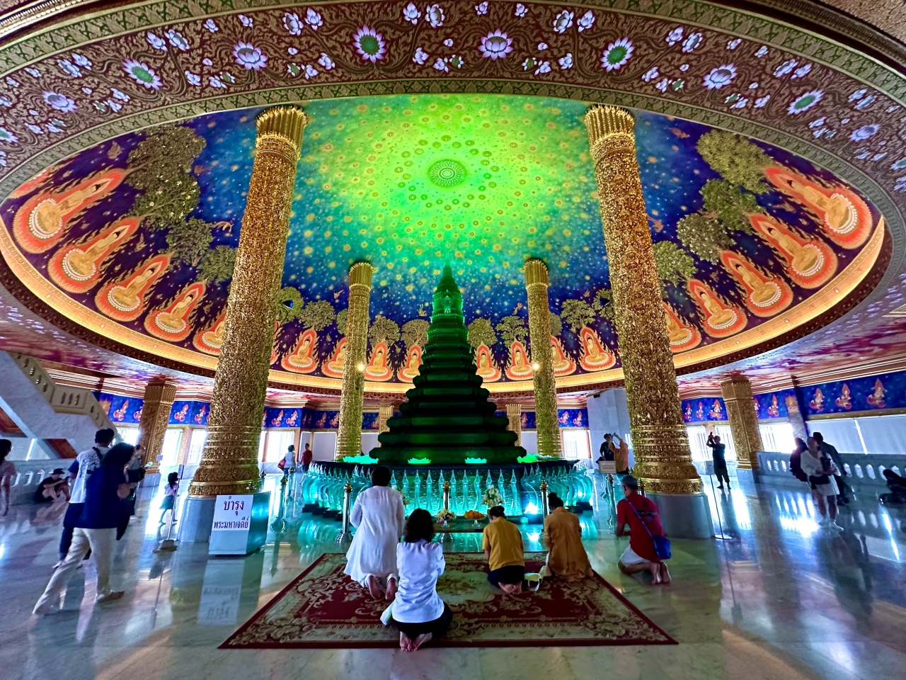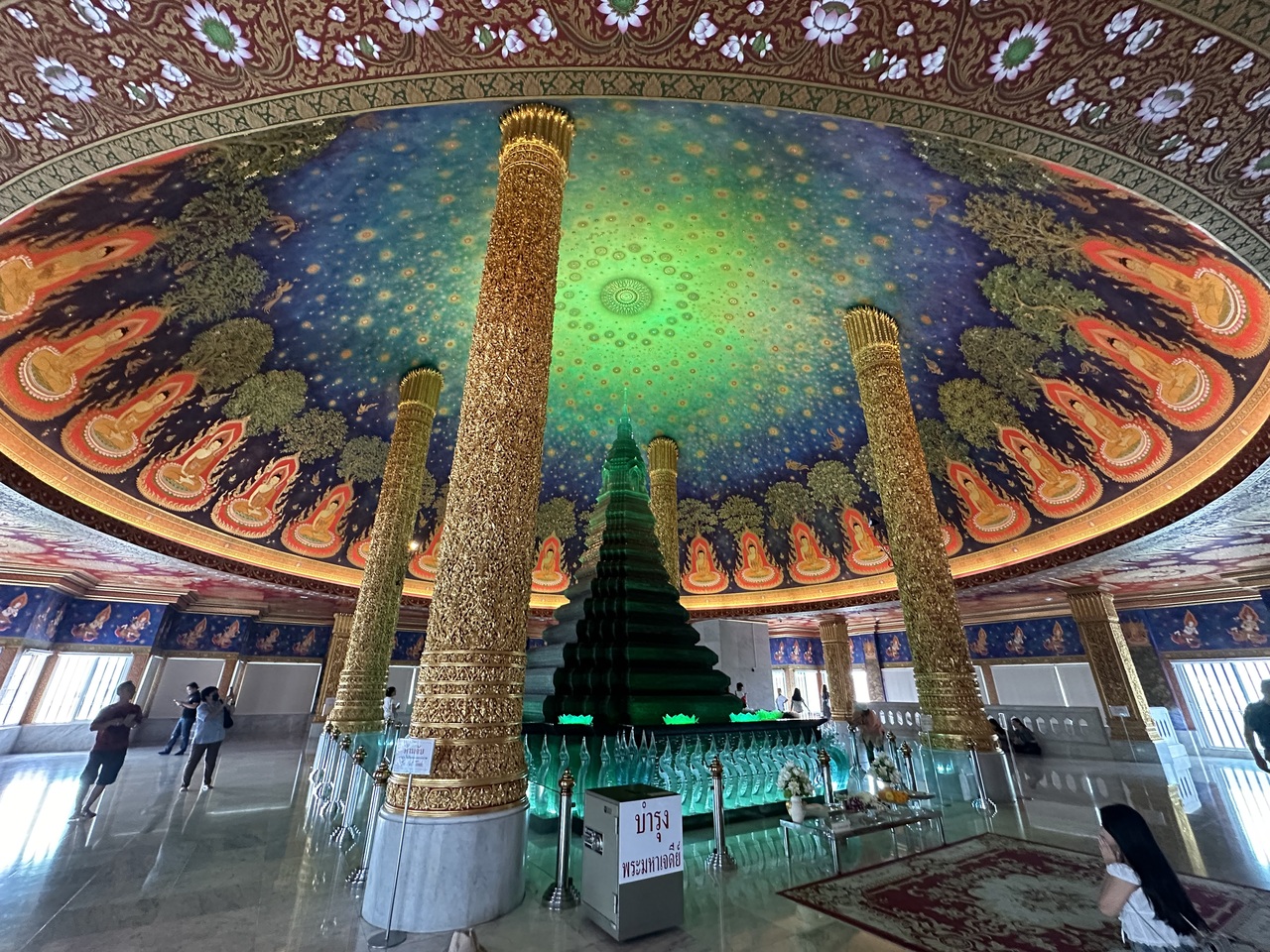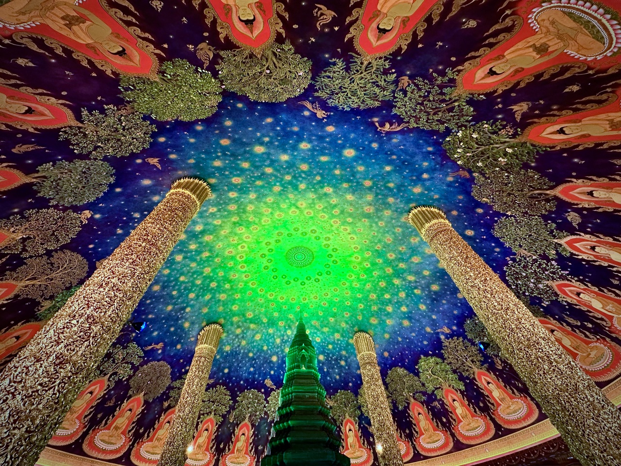 くだんの幻想天井画は、5階建ての白い大仏塔故(プミポン王と王妃の72歳の誕生日を記念して建設)の最上階にあり、この塔自体は、総工費約20億円をかけて2012年に完成したんだとか...へぇ--
