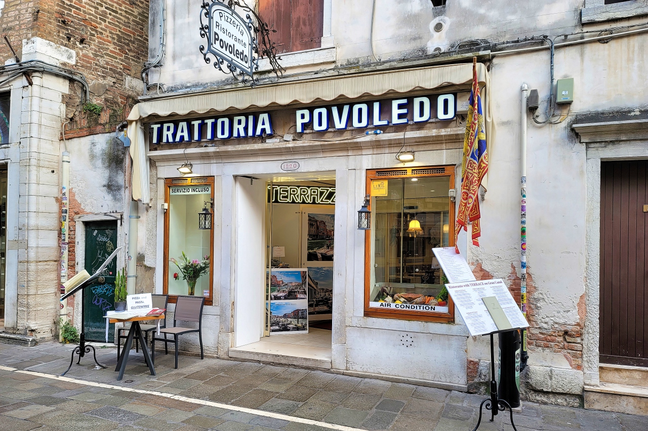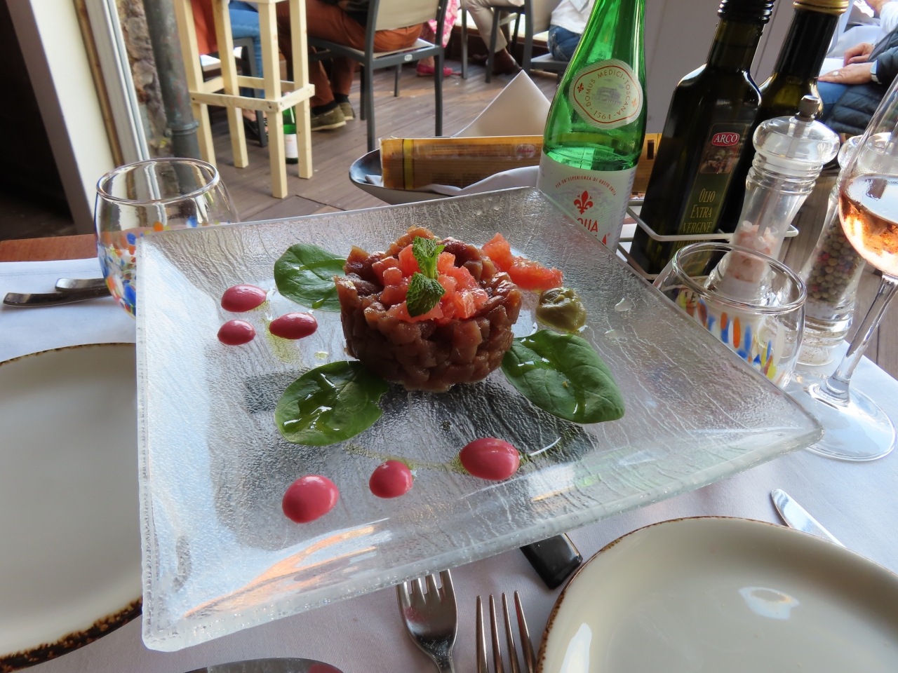 カナル・グランデ沿いにあり、宿泊したホテルからも近く、観光の帰りに立ち寄るのに便利ということで訪問。ダン・ブラウンの『インフェルノ』に登場する、スカルツィ橋をくぐったところにある天蓋付きのレストランの一つ。店内は広く、大運河近くの席へ。前菜にマグロのタルタル、家内はアマトリチャーナ、私は牛肉のタリアータをオーダーし、ロゼのスパークリングワインとともにいただきました。ゆっくり食事を楽しむことができました。