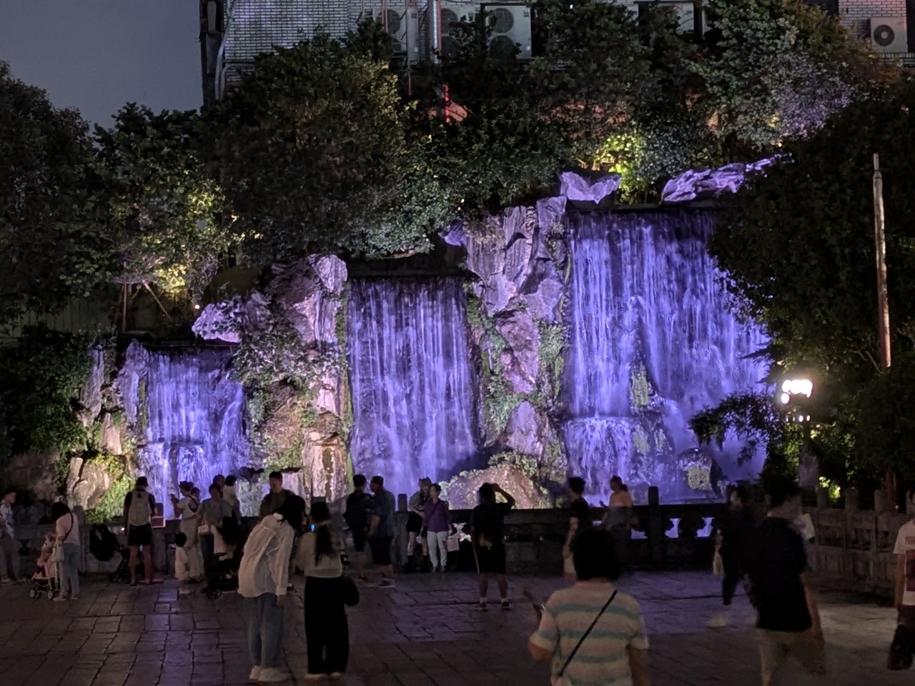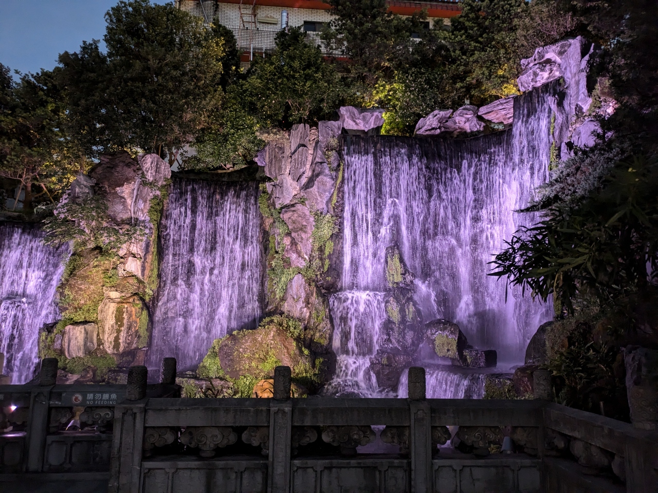 龍山寺の中に有る人工の滝ですが、今回はライトアップされていてとっても綺麗でした。