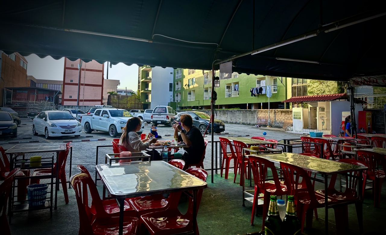 調理するお店に入りきれず、道を一本挟んだ目の前の大きな駐車場の一角に簡単なテント屋根の掛かった吹き抜けのスペースにも客席が並んでおり、こちらの方が眺めも良く、涼しくてベター。