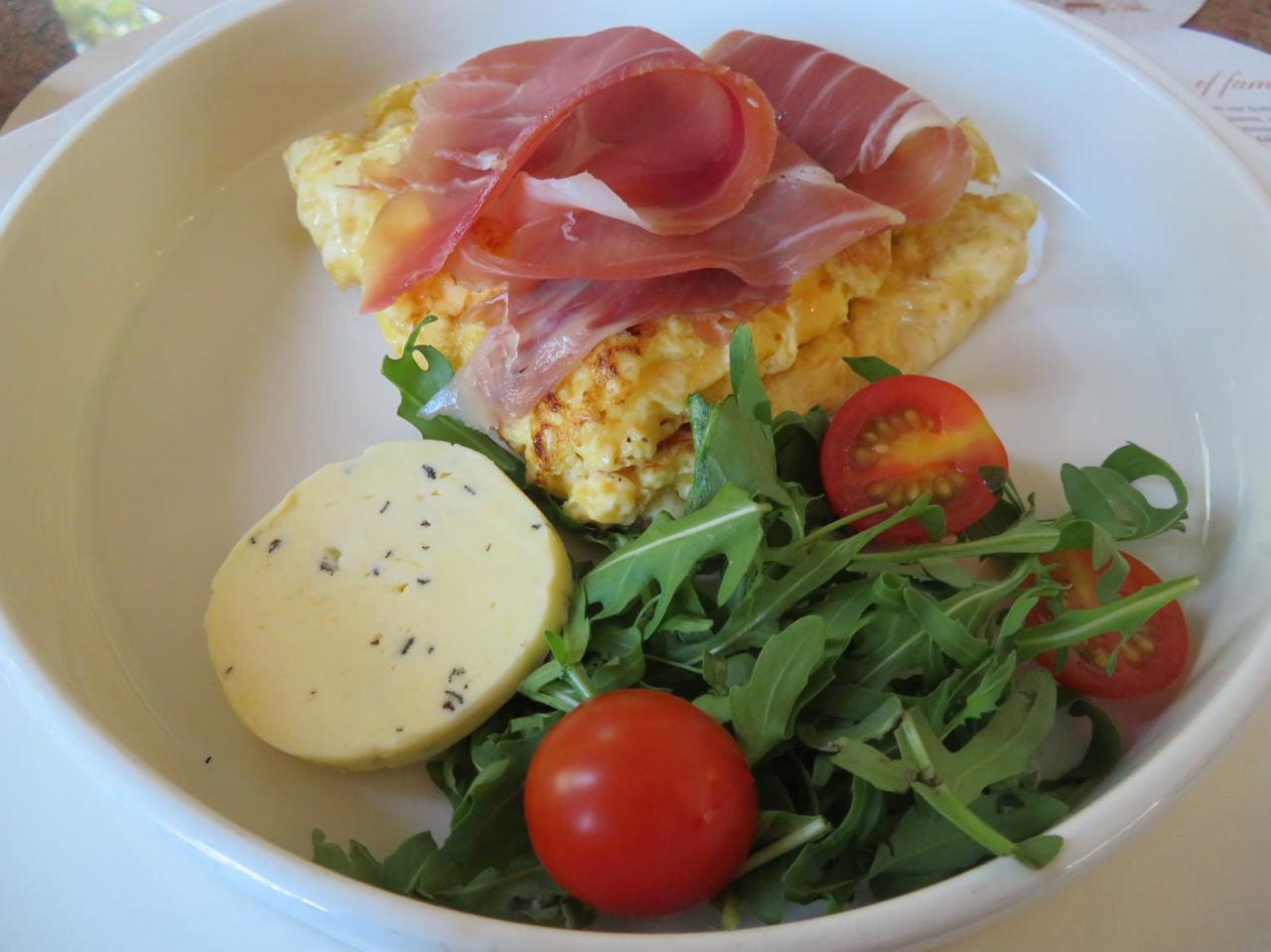 私たちはブランチで行き、まずは二人とも生ハム添えのオムレツを注文。