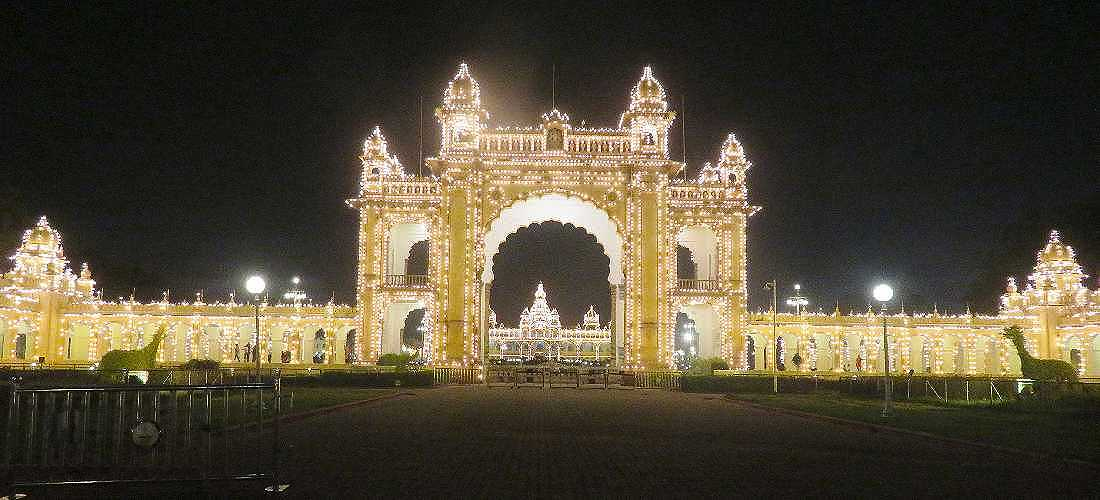 10月下旬の日曜日の昼と夜に訪れました。昼は宮殿内部を見学。見学者が多く、列を作って、一方通行の案内に従って、見て周りました。入場料は外国人は1000ルピーでした。宮殿内部の絢爛豪華さには圧倒されました。毎週日曜日の夕方7時から宮殿は10万個の電球が一斉に点灯してライトアップされ、無料で楽しむことが出来ます。私達がマイソールを訪れた最大の目的は、このライトアップを見るためでしたが、期待以上のすばらしさに感激しました。なお、宮殿の入場口は昼夜共に南門だけでしたので、間違わないように。ホテルの従業員ですら、どの門から入れるかを知らず、間違った門を教えてくれました。しっかり確認してから、出かけてください。