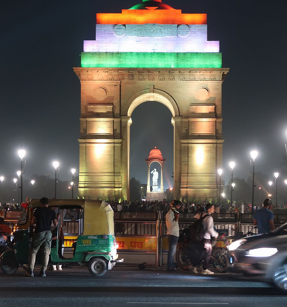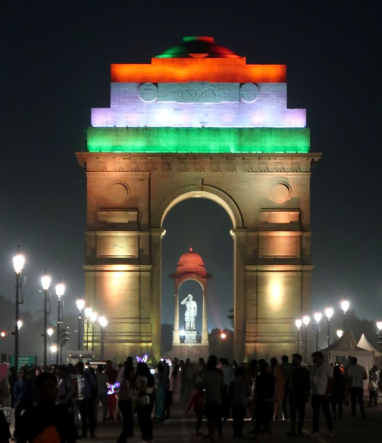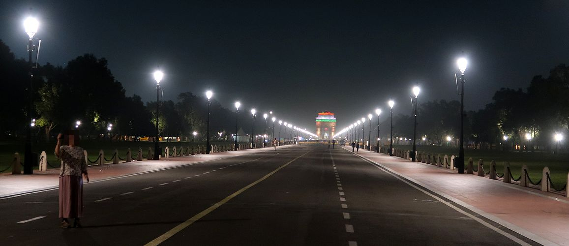 10月の中旬、デリーに着いた日の夜9時過ぎに、地下鉄Central Secretariat駅から、時間の節約のためツクツクに乗って行きました。降ろされた場所が、門とは道路を挟んだ反対側で、道路の両側はバリケードがはられていた上に、交通量が多過ぎて危険なため、道路を渡って門の下まで行くことはできませんでした。門と大統領府を結ぶ道路は歩行者天国になっており、安心して歩けるようになっていたので、帰りは門を振り返って撮影しながら歩いて地下鉄駅まで行きました。