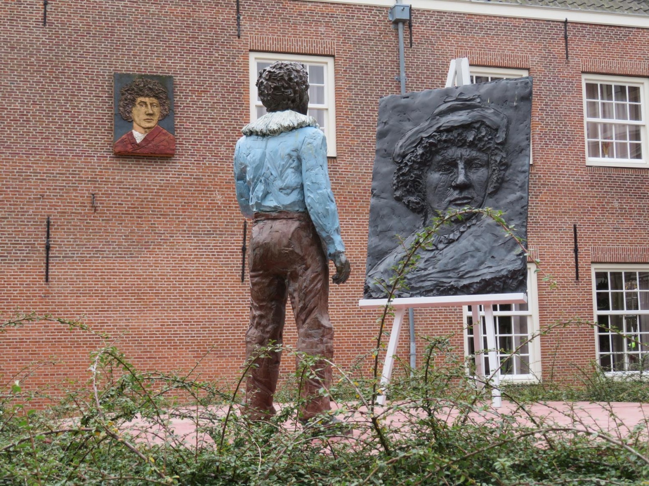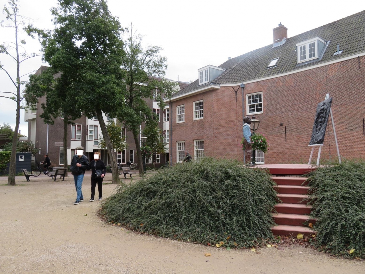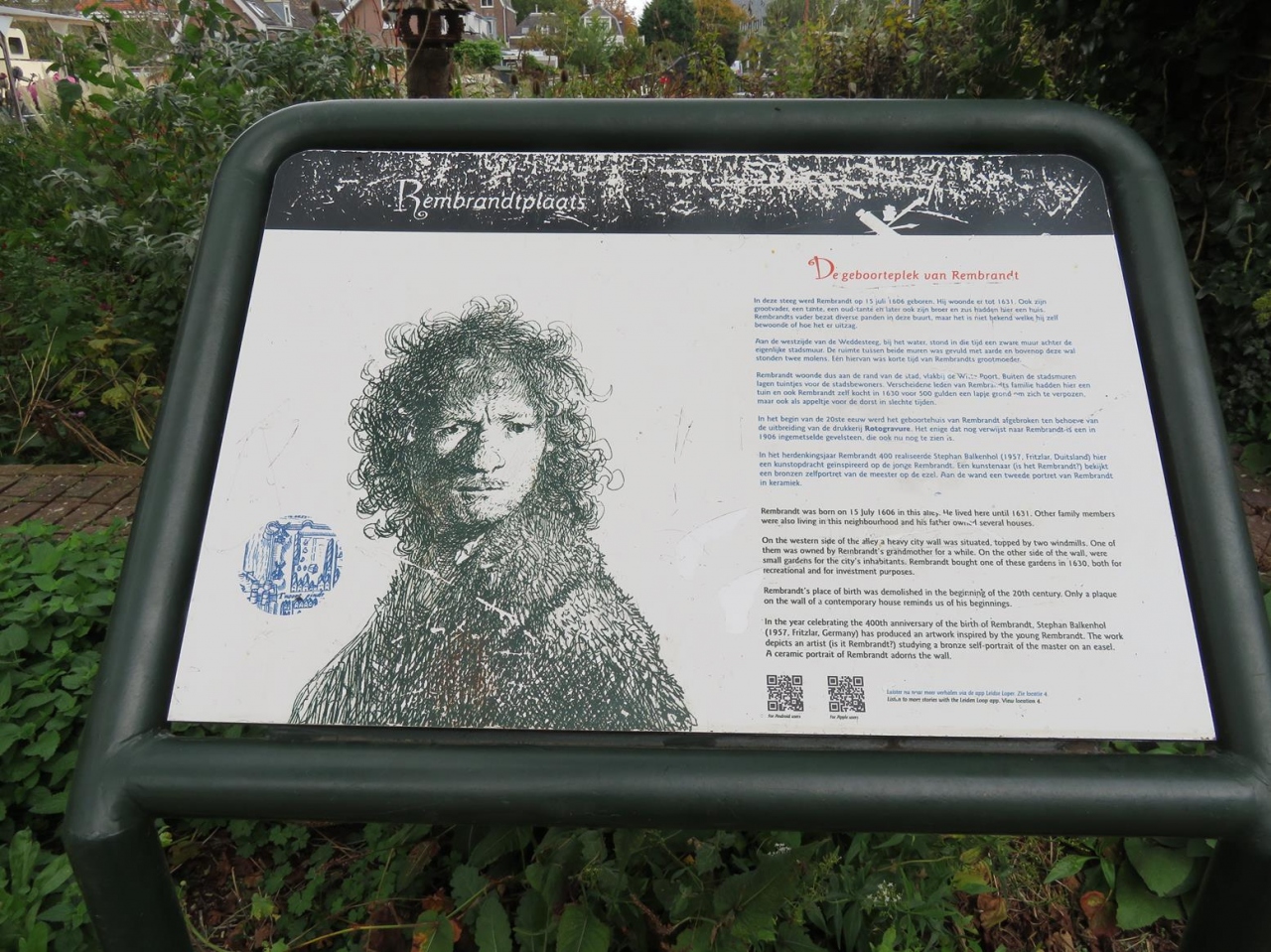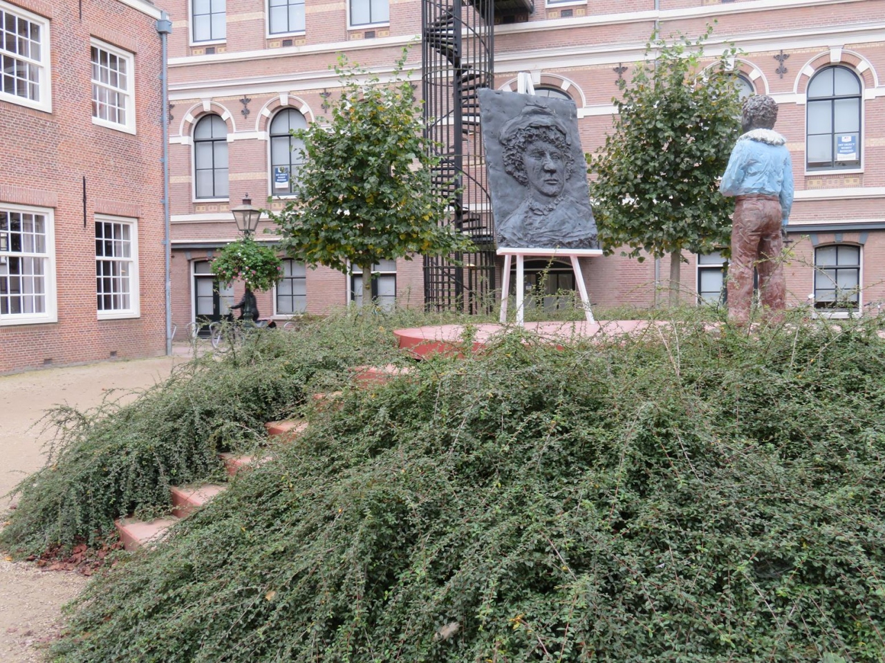 それだけではなく、その集合住宅前には小さなレンブラント広場があり、広場に面した建物には肖像プレートが出ていたり、広場の築山の上には記念オブジェが立っていたり、レンブラントに関する説明プレートもありました。